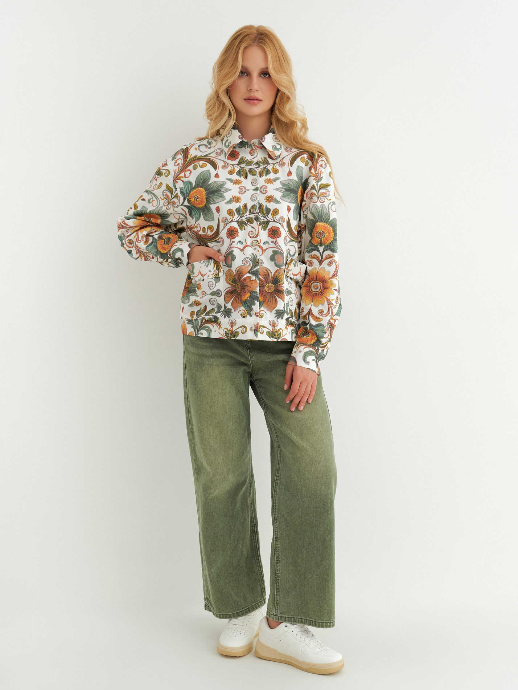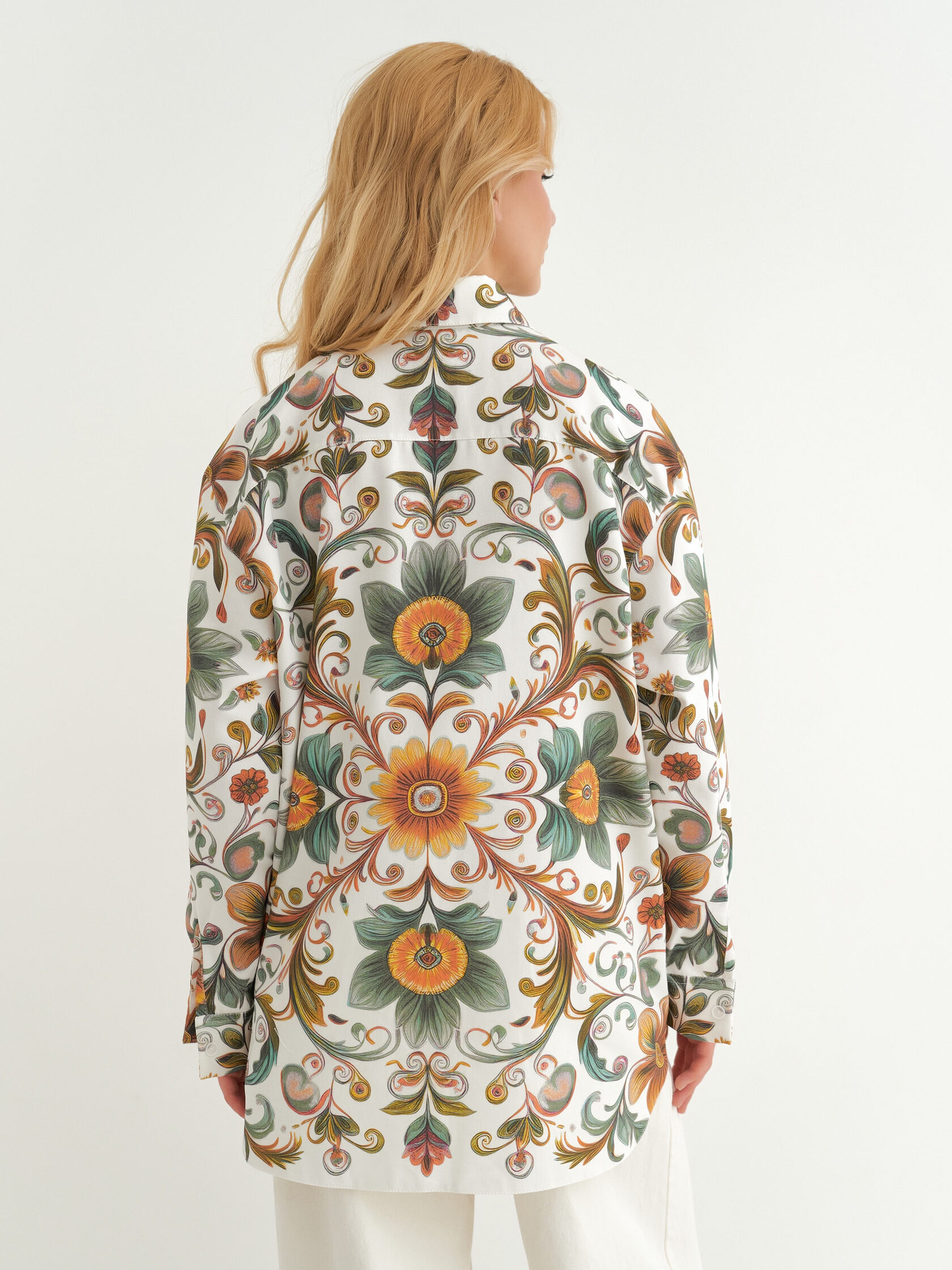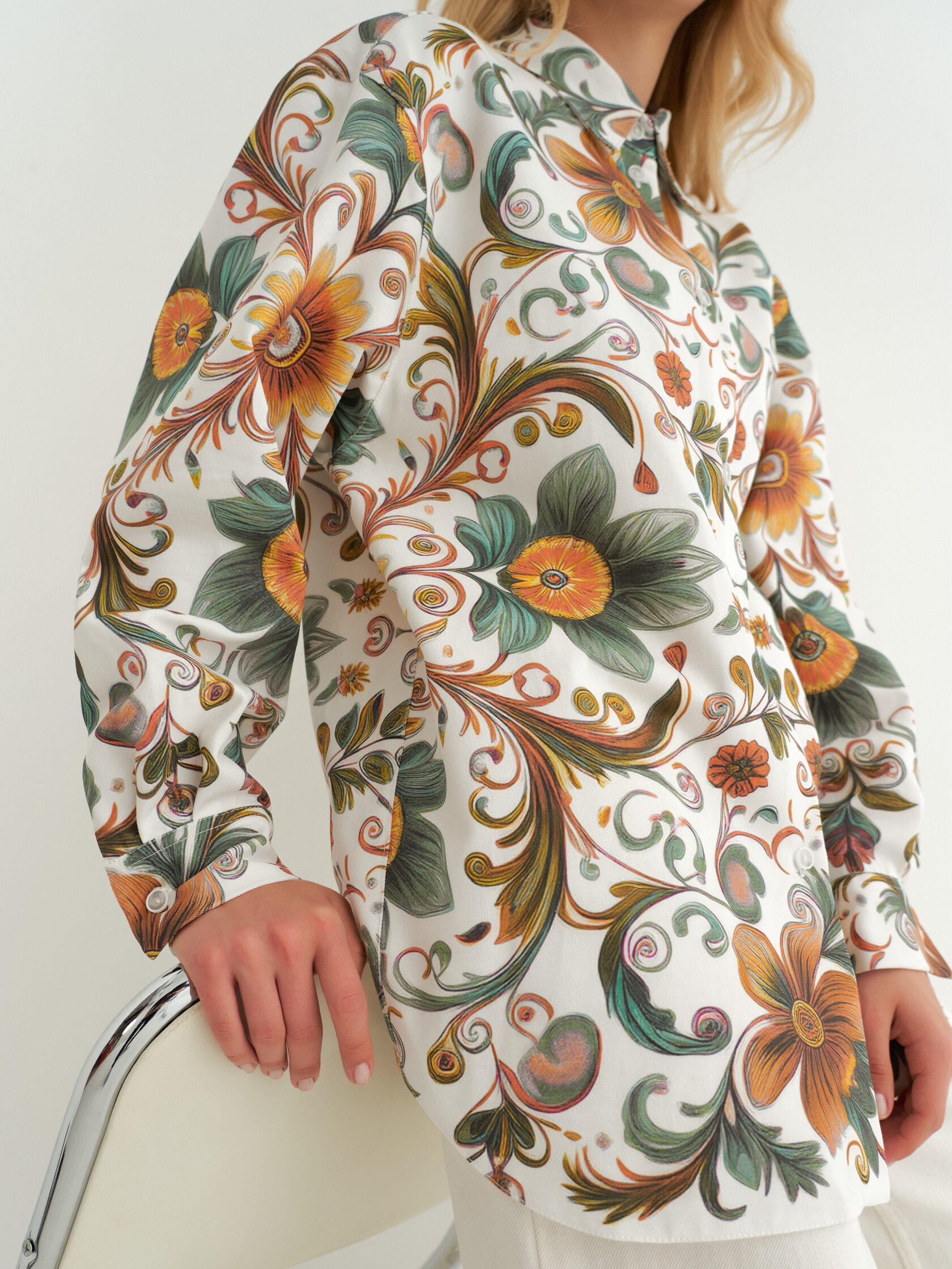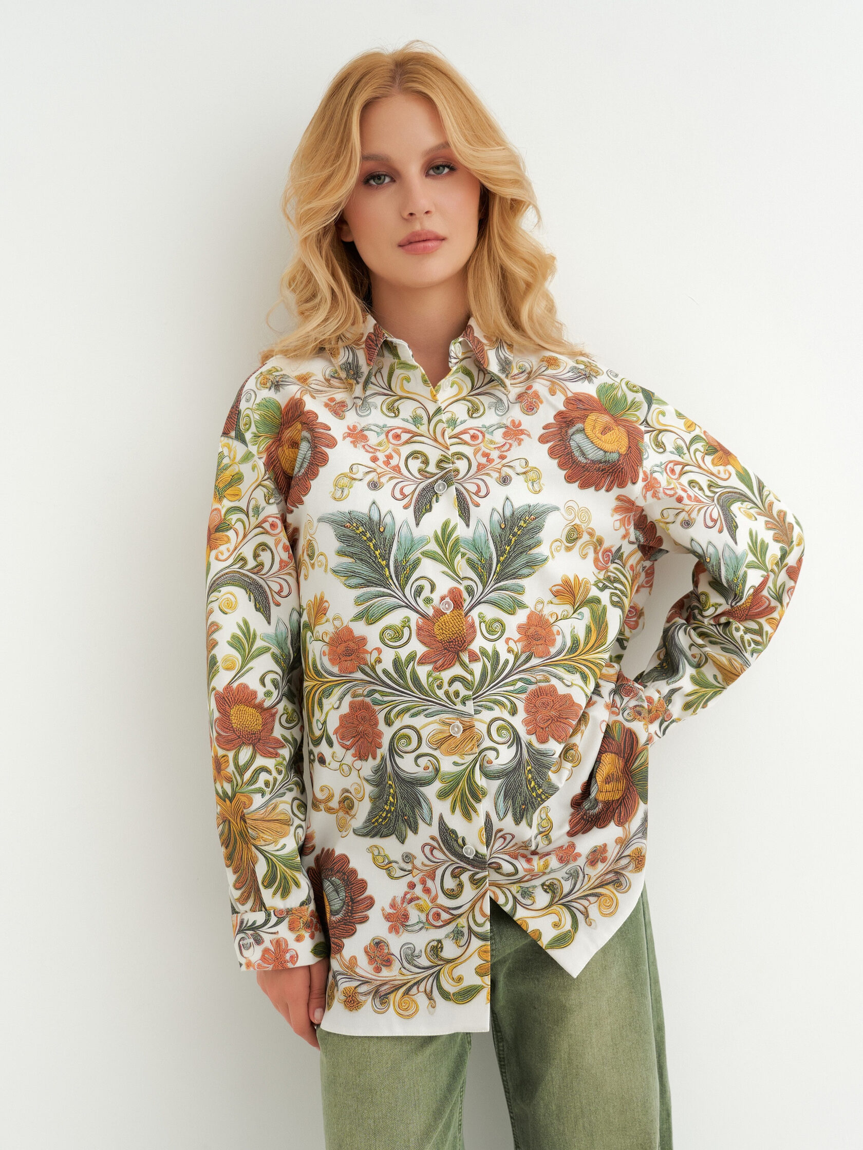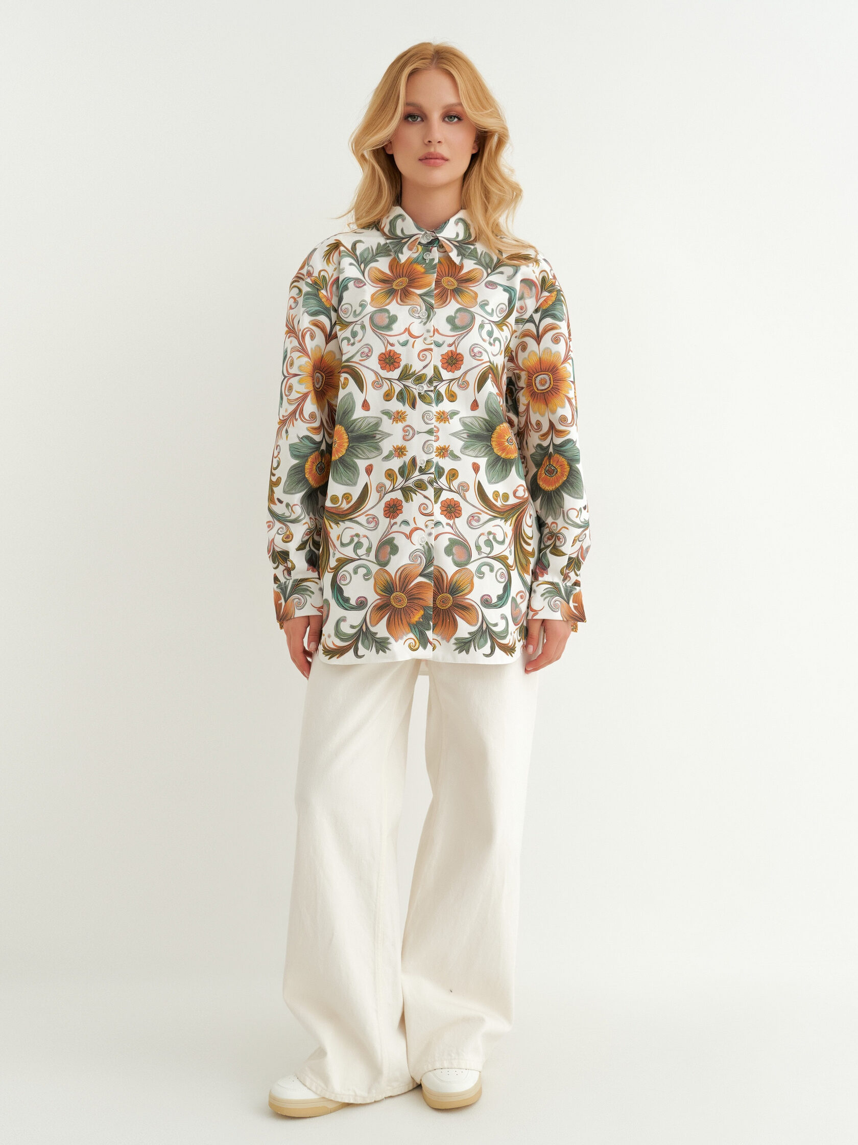 Плотная женская рубашка из 100% хлопка с выразительным принтом, вдохновлённым традиционной русской декоративной росписью. Модель выполнена в свободном силуэте (оверсайз), что делает её универсальной — подходит для любого типа фигуры и комфортна в носке в весенне-осенний период, а также прохладным летом. Основу принта составляет симметричный цветочный орнамент, построенный по канонам народного художественного языка. Центральные цветы — образы солнечной энергии, силы жизни и женского начала. Мотивы листьев и стеблей, переплетающихся в единую линию, отсылают к символам роста, плодородия и природной гармонии. Ритм и симметрия узора формируют визуальную стабильность и ощущение внутреннего порядка — характерную черту обережной символики. Цветовая палитра — насыщенные оттенки охры, терракота, зелени и тёплого серо-синего — придаёт рубашке утончённость и благородство. Белый фон подчёркивает чистоту композиции и делает рисунок особенно выразительным. Рубашка застёгивается на пуговицы, имеет длинный рукав с манжетами и закруглённый низ. Натуральный хлопок средней плотности обеспечивает отличную воздухопроницаемость, мягкость и долговечность. Подходит как самостоятельный элемент гардероба, так и в качестве лёгкой верхней одежды. Идеально сочетается с джинсами, юбками, льняными брюками.