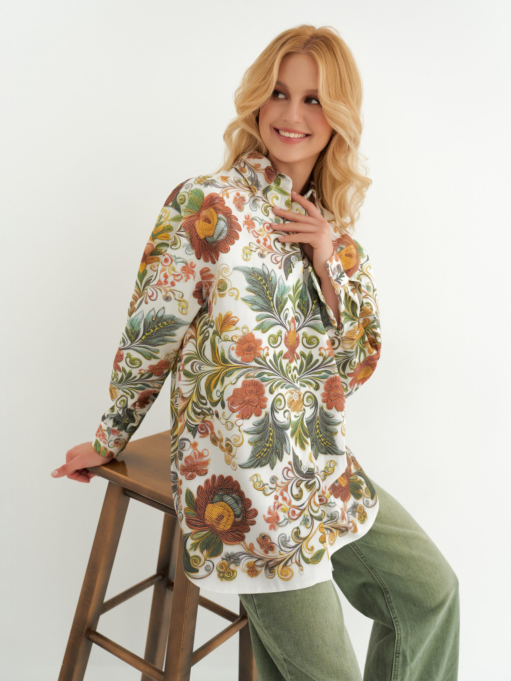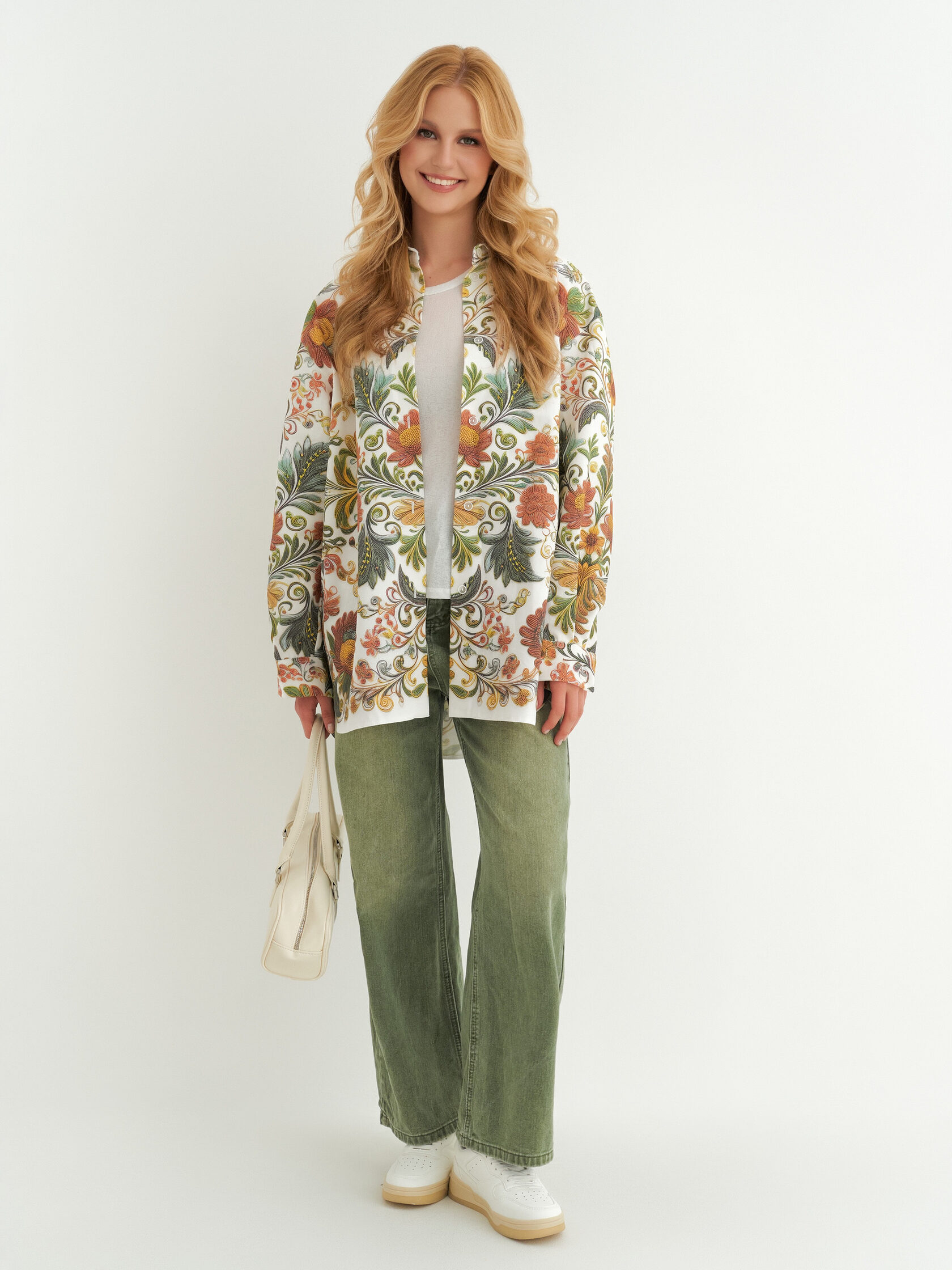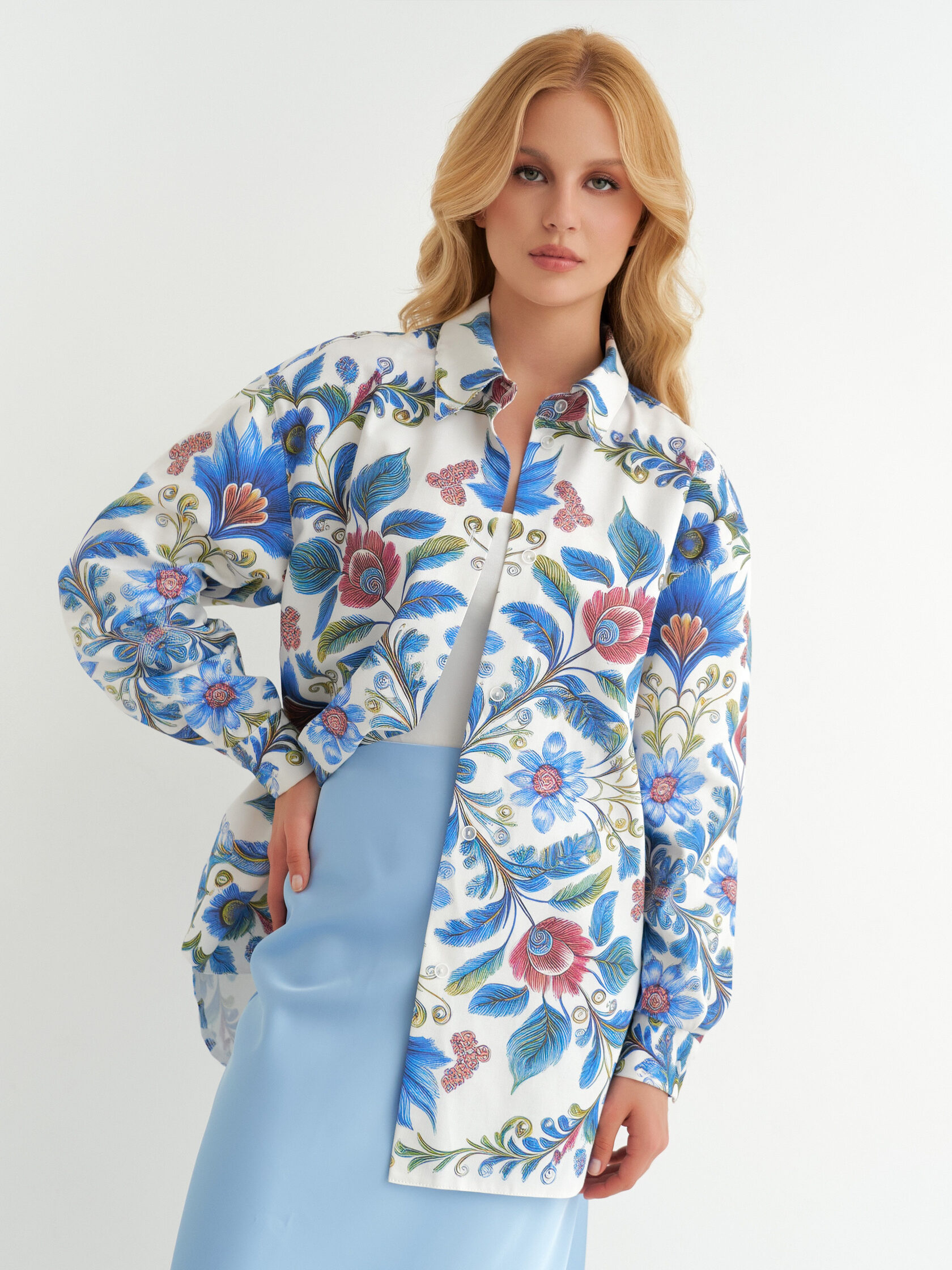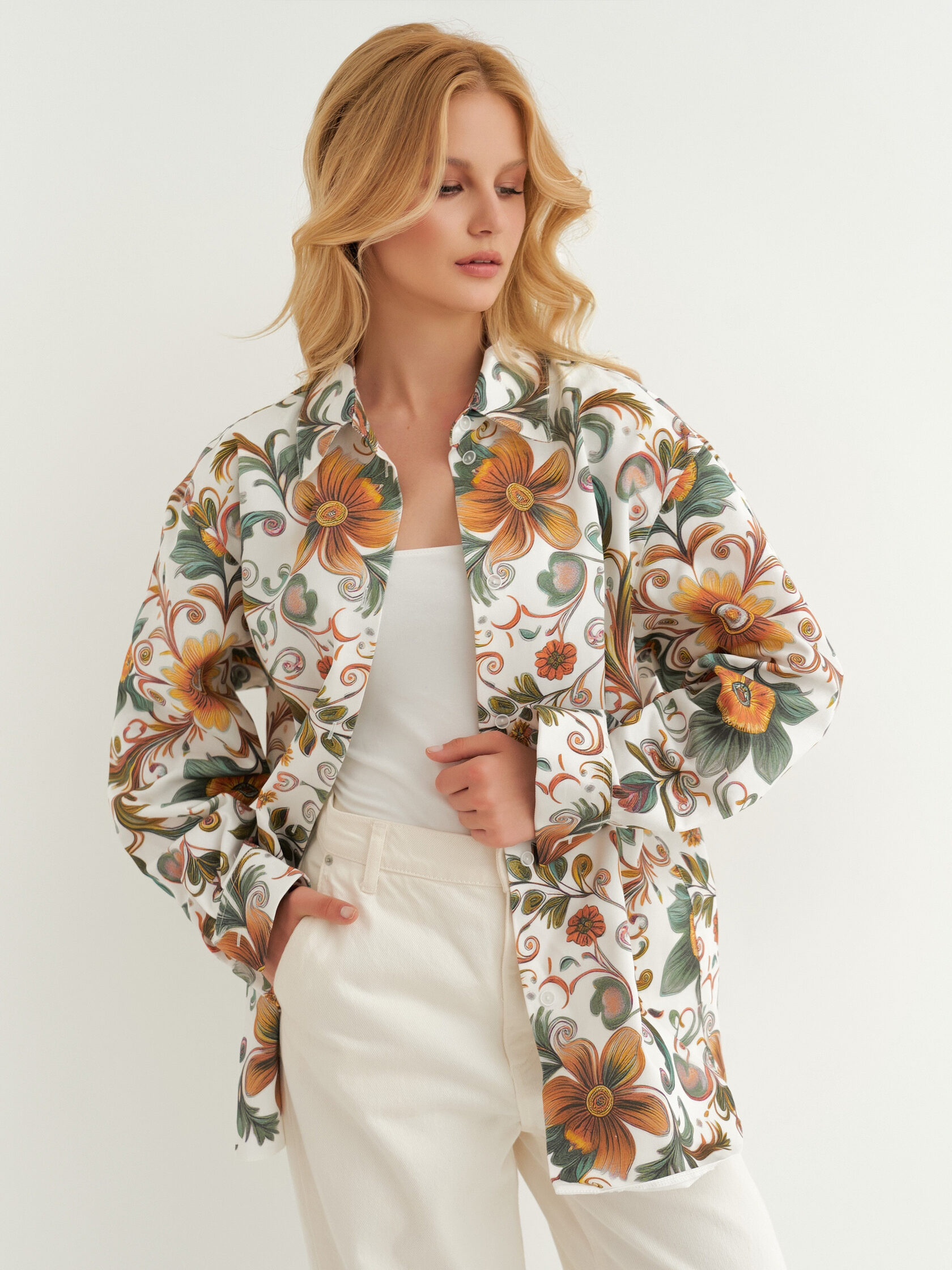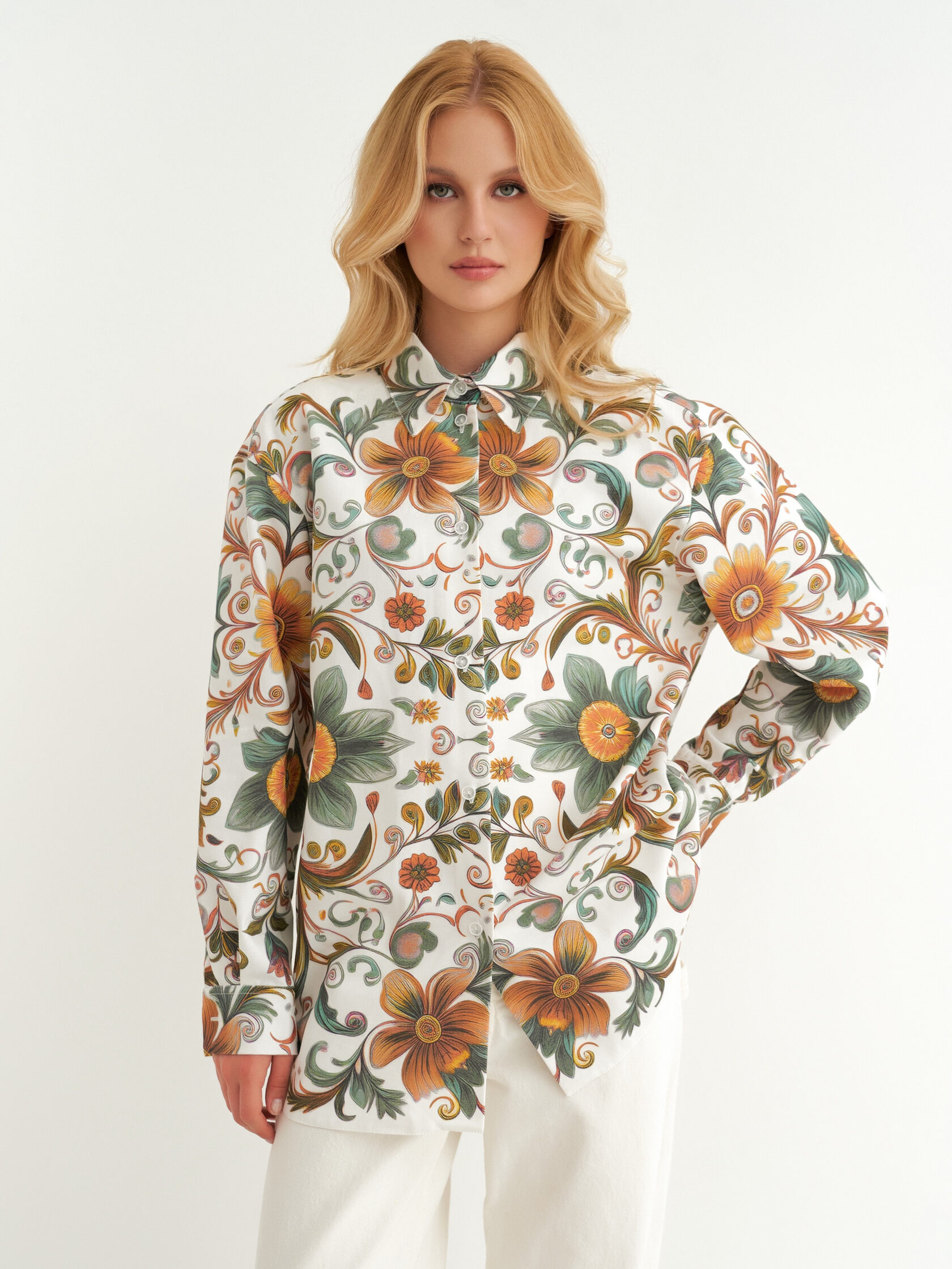 Плотная женская рубашка из 100% хлопка с выразительным принтом, вдохновлённым традиционной русской декоративной росписью. Модель выполнена в свободном силуэте (оверсайз), что делает её универсальной — подходит для любого типа фигуры и комфортна в носке в весенне-осенний период, а также прохладным летом. Основу принта составляет симметричный цветочный орнамент, построенный по канонам народного художественного языка. Центральные цветы — образы солнечной энергии, силы жизни и женского начала. Мотивы листьев и стеблей, переплетающихся в единую линию, отсылают к символам роста, плодородия и природной гармонии. Ритм и симметрия узора формируют визуальную стабильность и ощущение внутреннего порядка — характерную черту обережной символики. Цветовая палитра — насыщенные оттенки охры, терракота, зелени и тёплого серо-синего — придаёт рубашке утончённость и благородство. Белый фон подчёркивает чистоту композиции и делает рисунок особенно выразительным. Рубашка застёгивается на пуговицы, имеет длинный рукав с манжетами и закруглённый низ. Натуральный хлопок средней плотности обеспечивает отличную воздухопроницаемость, мягкость и долговечность. Подходит как самостоятельный элемент гардероба, так и в качестве лёгкой верхней одежды. Идеально сочетается с джинсами, юбками, льняными брюками.