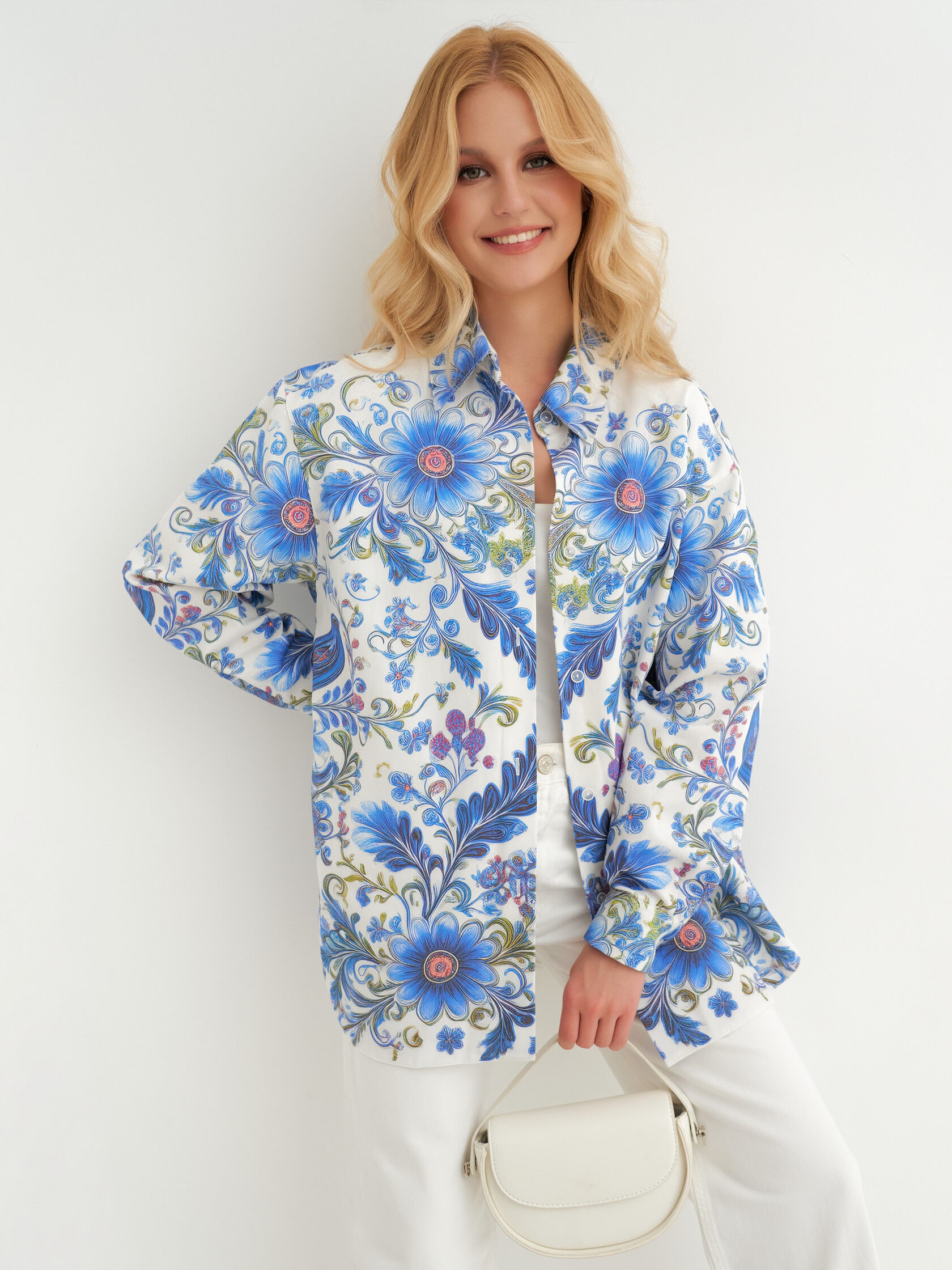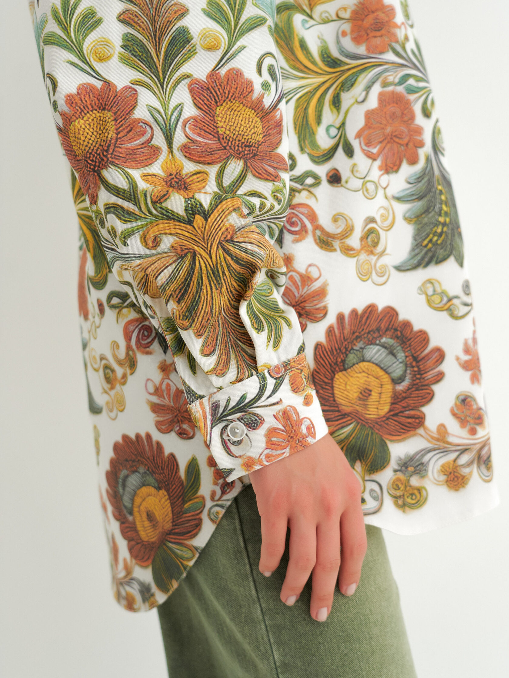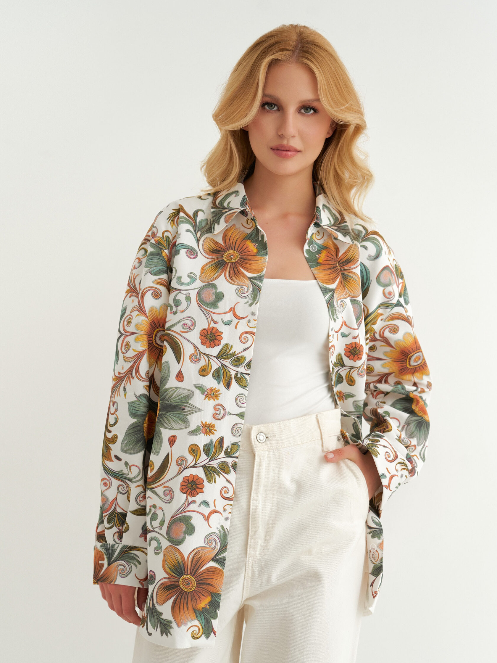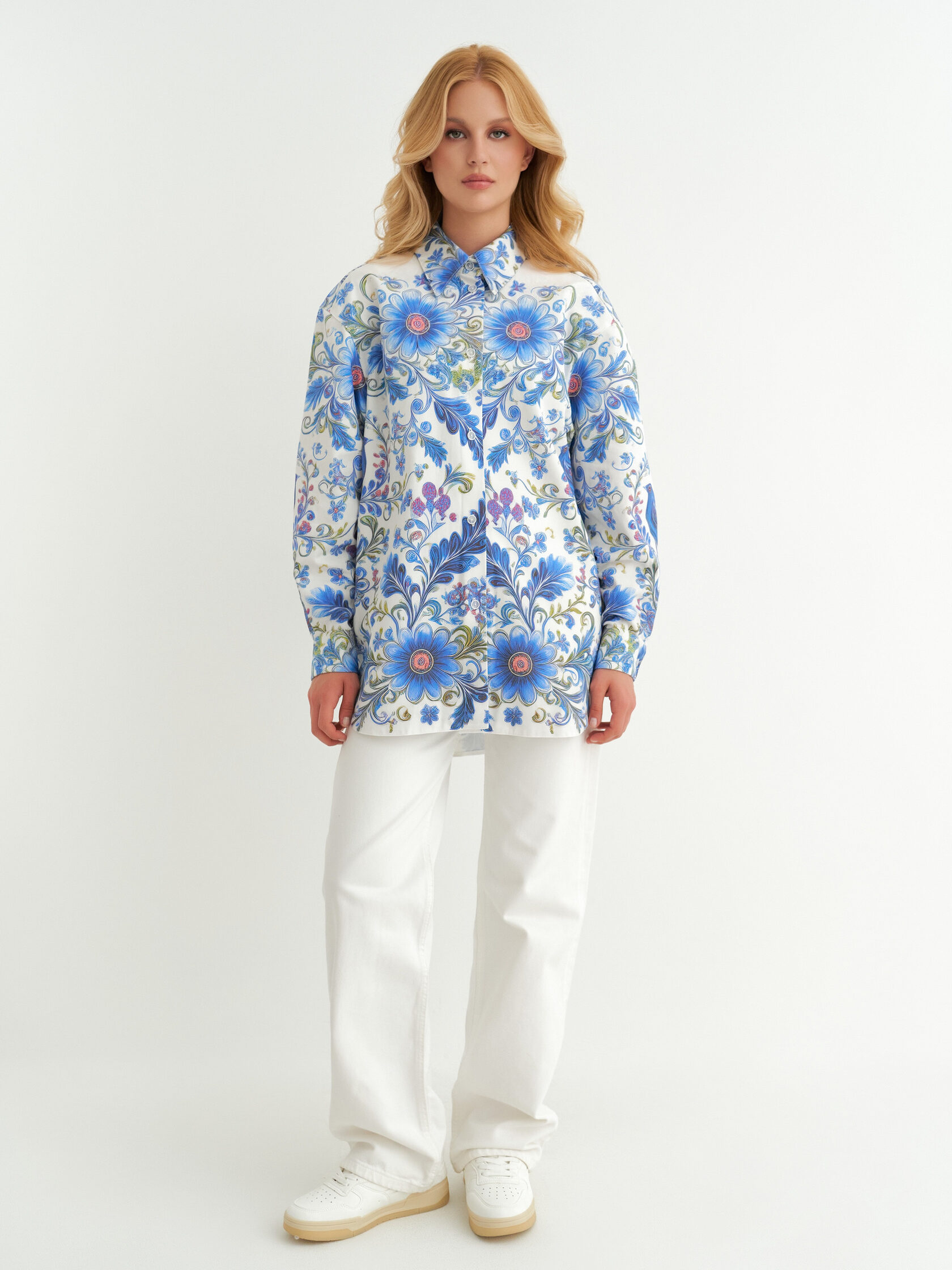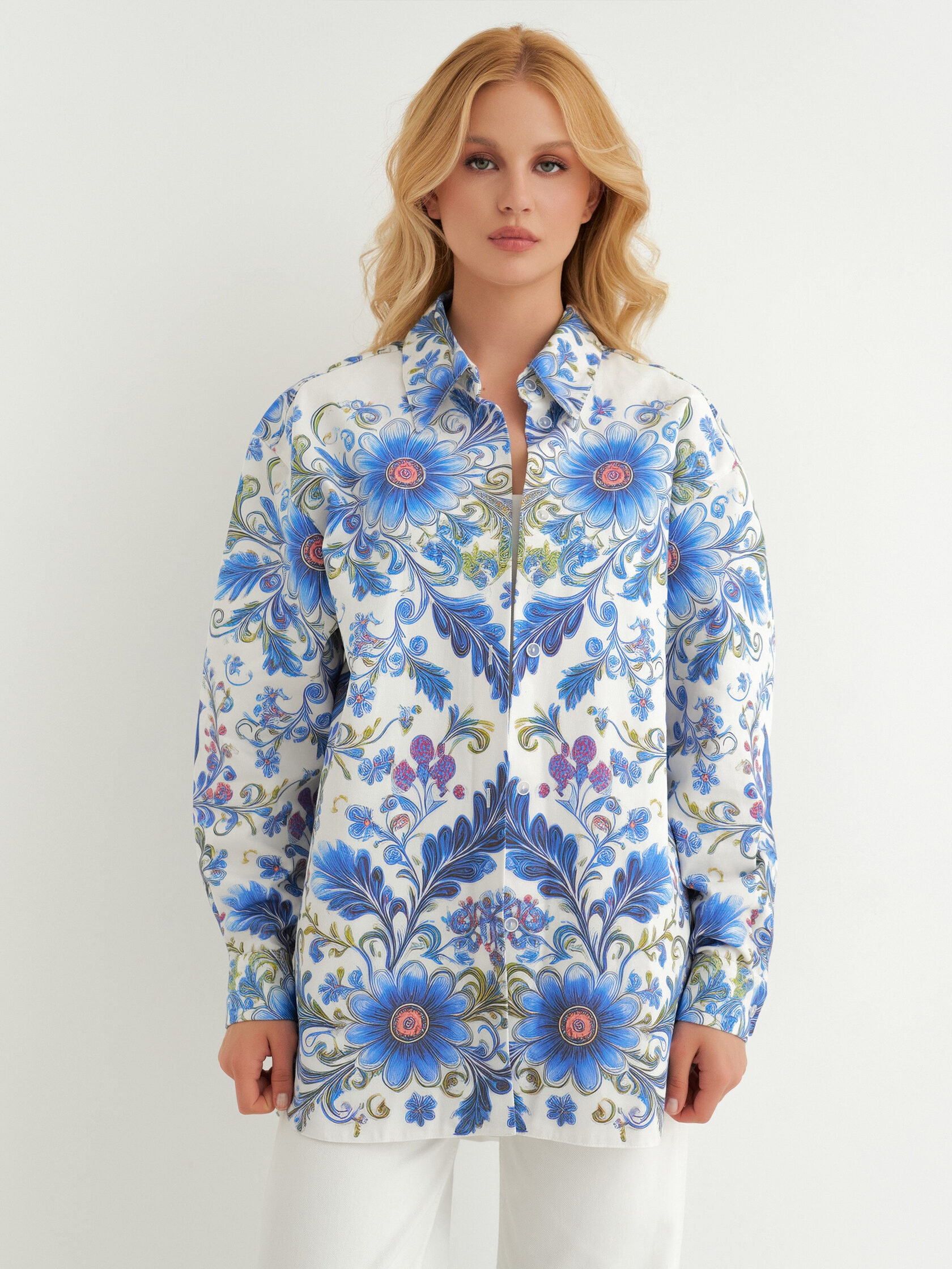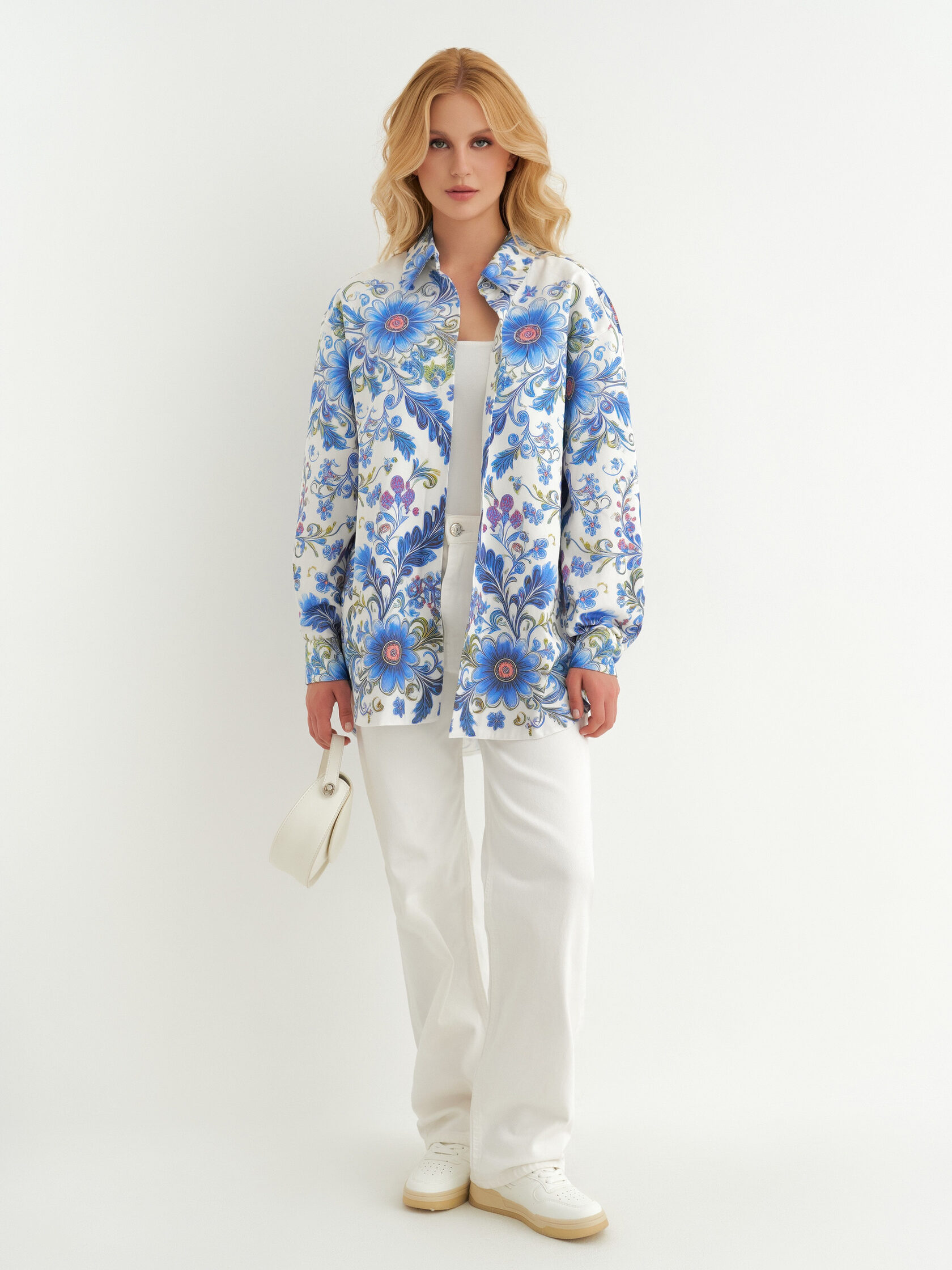 Плотная женская рубашка из 100% хлопка с выразительным принтом, вдохновлённым традиционной русской декоративной росписью. Модель выполнена в свободном силуэте (оверсайз), что делает её универсальной — подходит для любого типа фигуры и комфортна в носке в весенне-осенний период, а также прохладным летом. Основу принта составляет симметричный цветочный орнамент, построенный по канонам народного художественного языка. Центральные цветы — образы солнечной энергии, силы жизни и женского начала. Мотивы листьев и стеблей, переплетающихся в единую линию, отсылают к символам роста, плодородия и природной гармонии. Ритм и симметрия узора формируют визуальную стабильность и ощущение внутреннего порядка — характерную черту обережной символики. Цветовая палитра — насыщенные оттенки охры, терракота, зелени и тёплого серо-синего — придаёт рубашке утончённость и благородство. Белый фон подчёркивает чистоту композиции и делает рисунок особенно выразительным. Рубашка застёгивается на пуговицы, имеет длинный рукав с манжетами и закруглённый низ. Натуральный хлопок средней плотности обеспечивает отличную воздухопроницаемость, мягкость и долговечность. Подходит как самостоятельный элемент гардероба, так и в качестве лёгкой верхней одежды. Идеально сочетается с джинсами, юбками, льняными брюками.