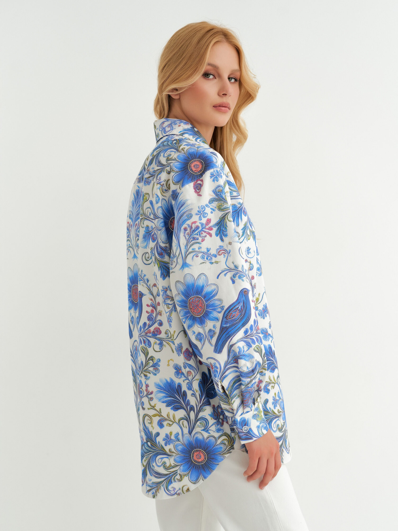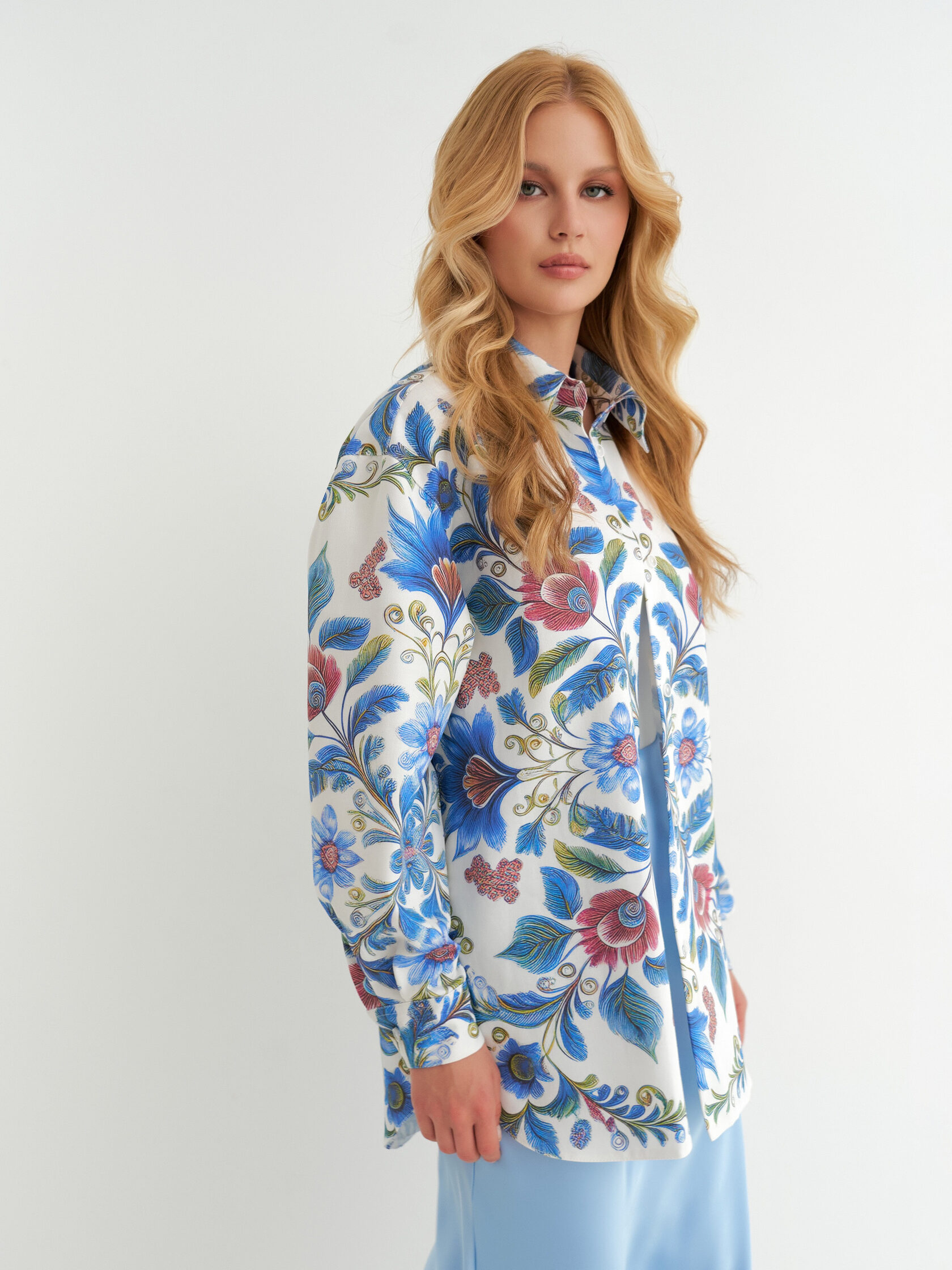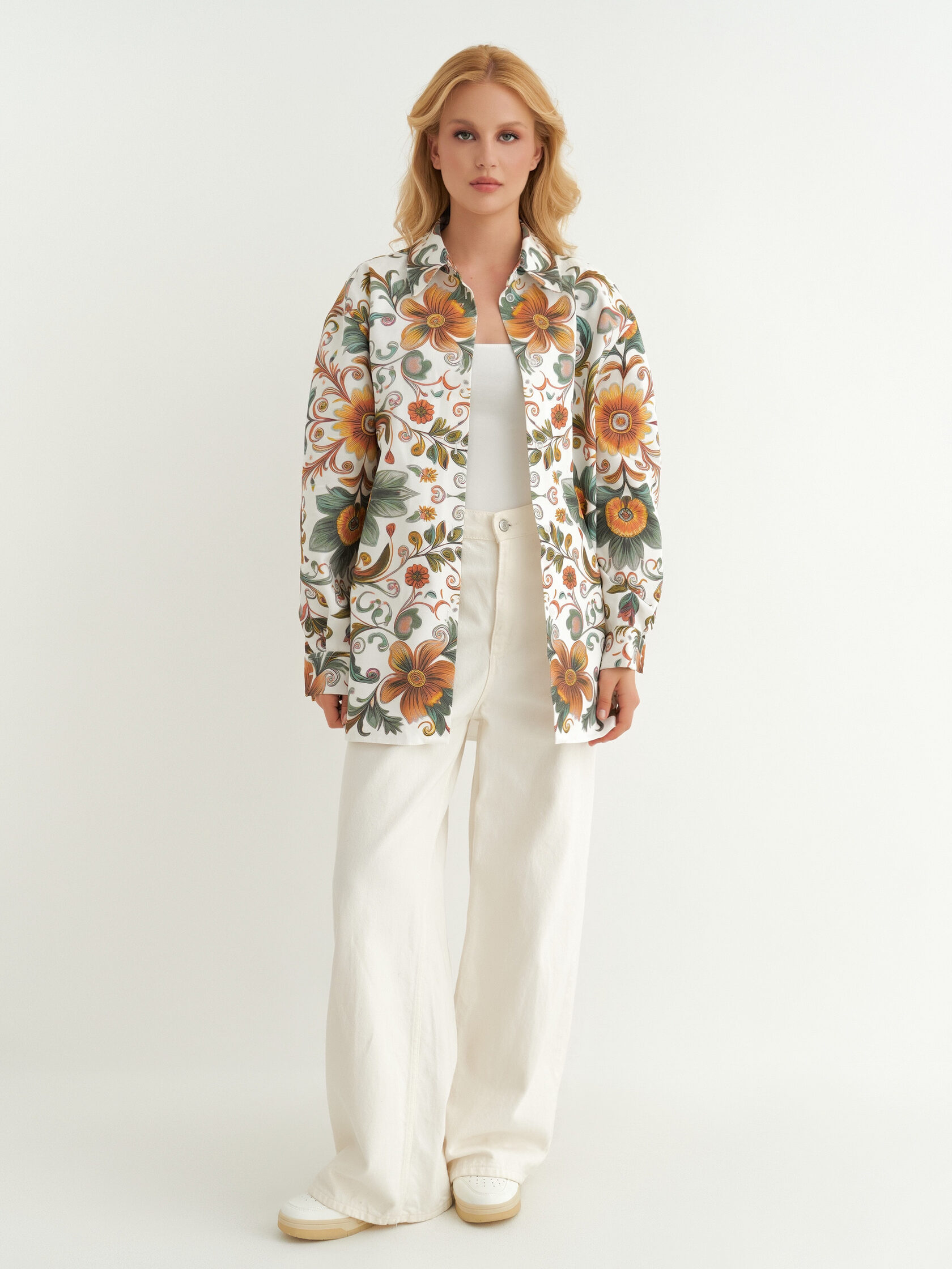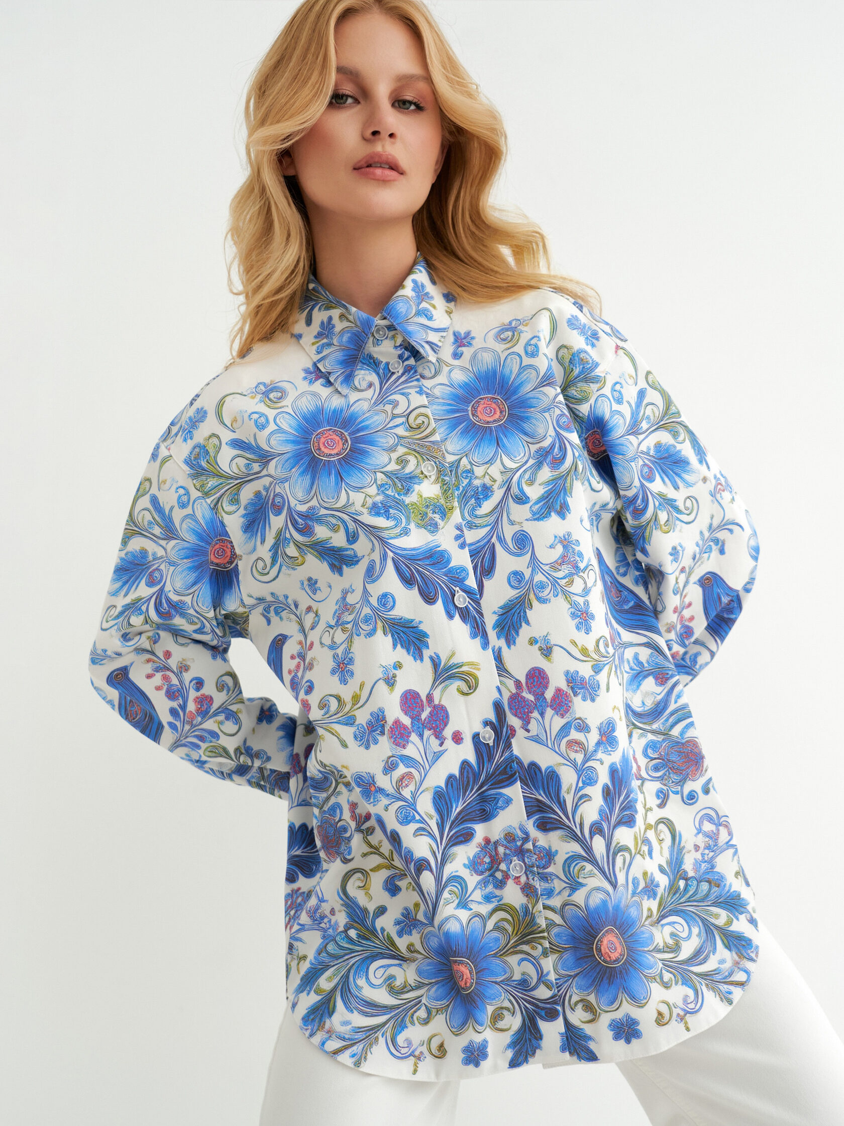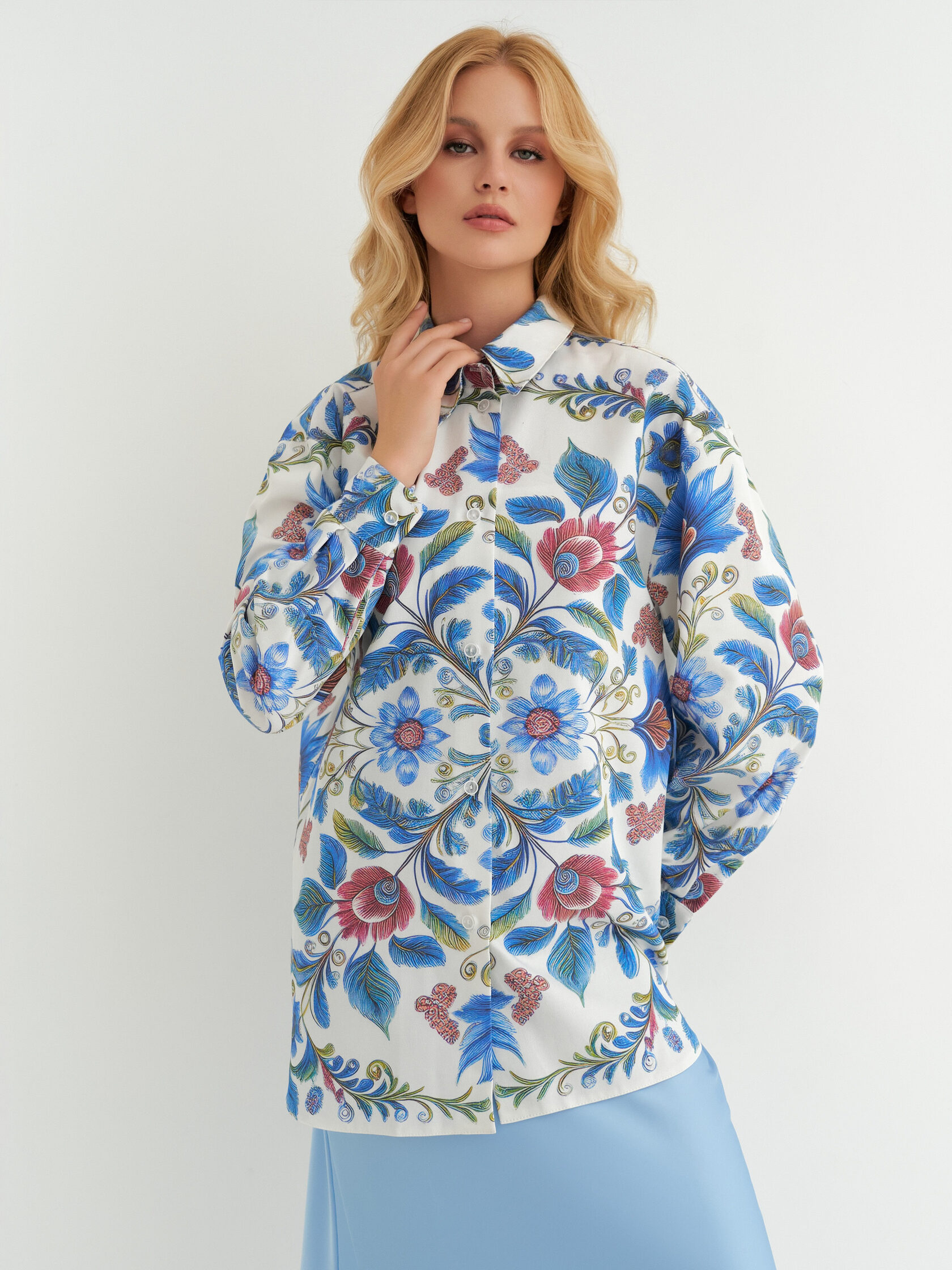 Плотная женская рубашка из 100% хлопка с выразительным принтом, вдохновлённым традиционной русской декоративной росписью. Модель выполнена в свободном силуэте (оверсайз), что делает её универсальной — подходит для любого типа фигуры и комфортна в носке в весенне-осенний период, а также прохладным летом. Основу принта составляет симметричный цветочный орнамент, построенный по канонам народного художественного языка. Центральные цветы — образы солнечной энергии, силы жизни и женского начала. Мотивы листьев и стеблей, переплетающихся в единую линию, отсылают к символам роста, плодородия и природной гармонии. Ритм и симметрия узора формируют визуальную стабильность и ощущение внутреннего порядка — характерную черту обережной символики. Цветовая палитра — насыщенные оттенки охры, терракота, зелени и тёплого серо-синего — придаёт рубашке утончённость и благородство. Белый фон подчёркивает чистоту композиции и делает рисунок особенно выразительным. Рубашка застёгивается на пуговицы, имеет длинный рукав с манжетами и закруглённый низ. Натуральный хлопок средней плотности обеспечивает отличную воздухопроницаемость, мягкость и долговечность. Подходит как самостоятельный элемент гардероба, так и в качестве лёгкой верхней одежды. Идеально сочетается с джинсами, юбками, льняными брюками.