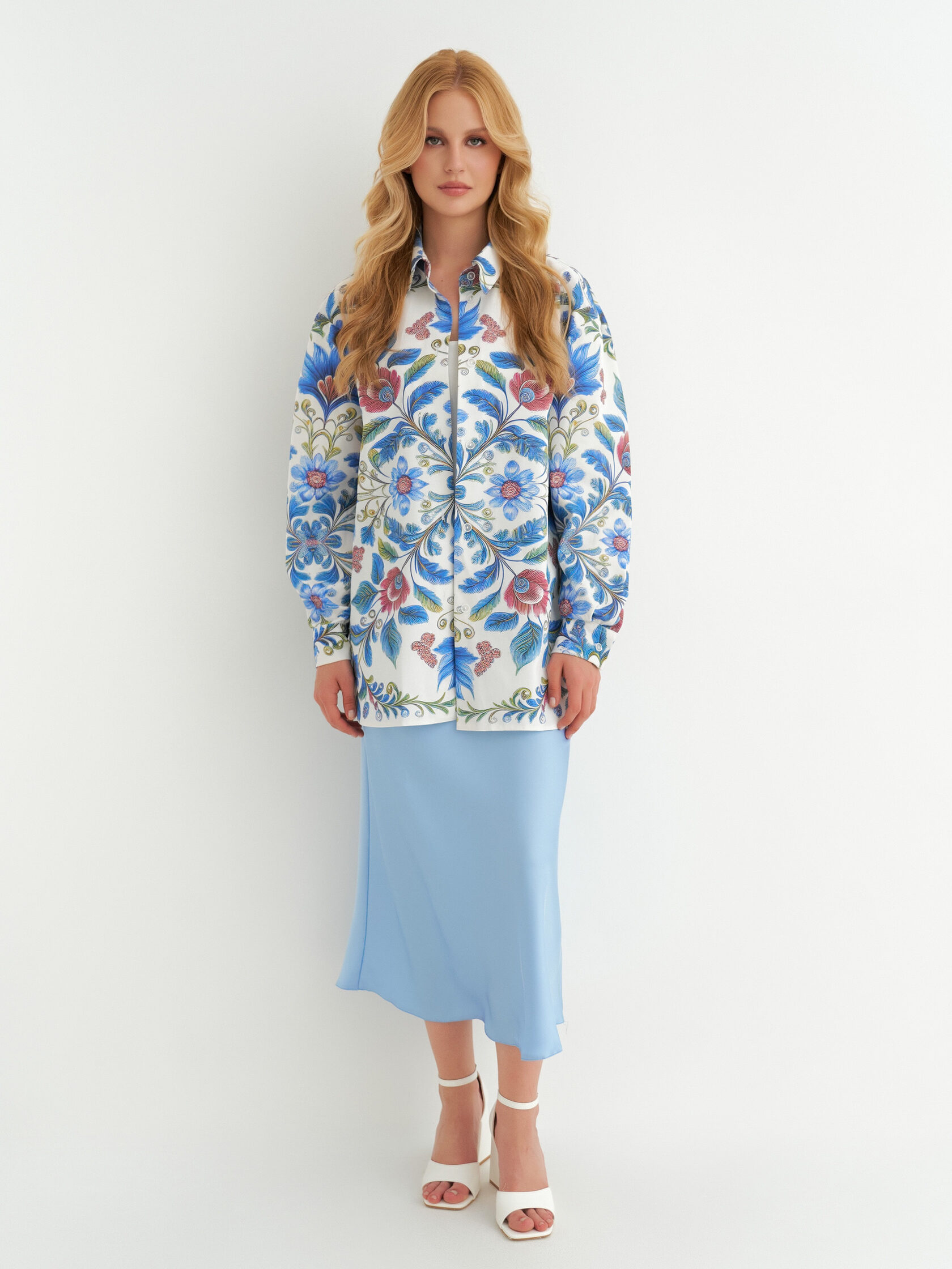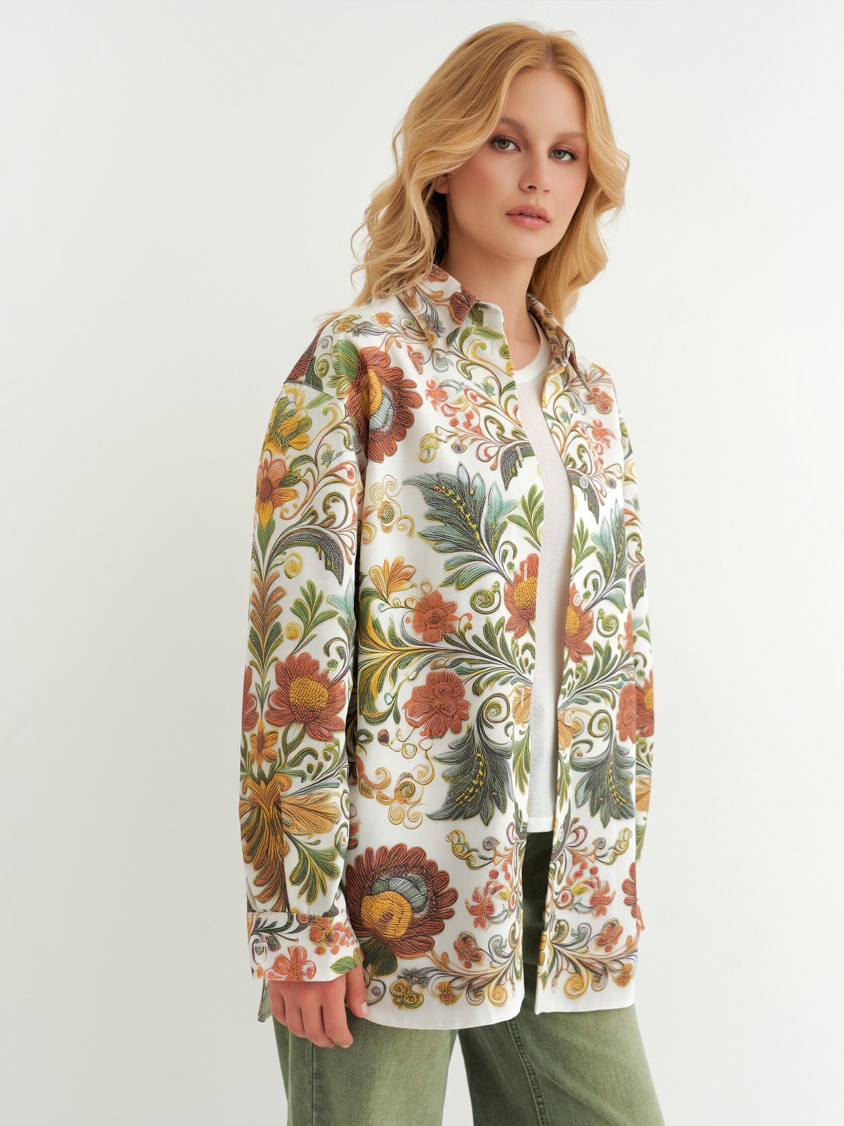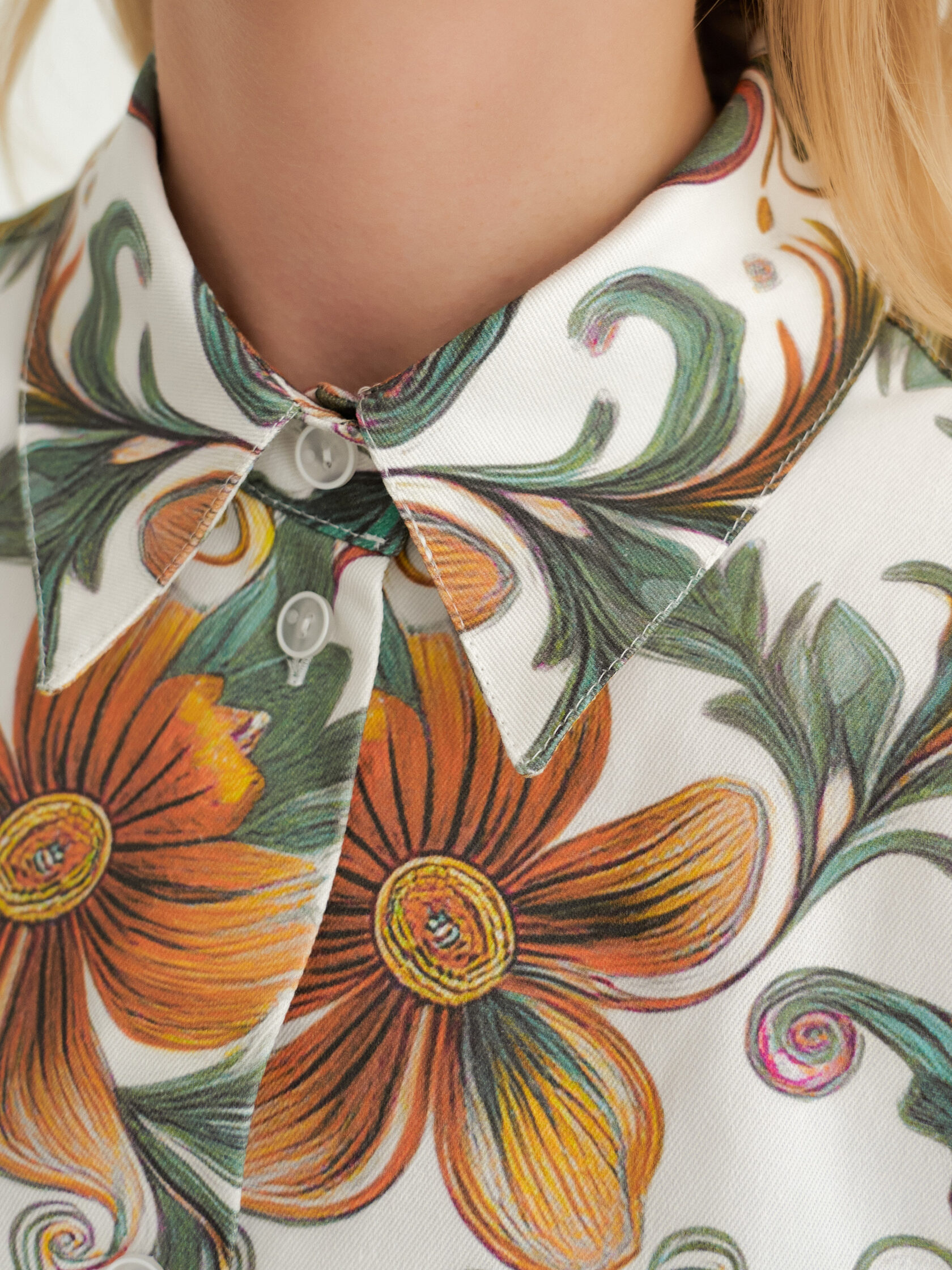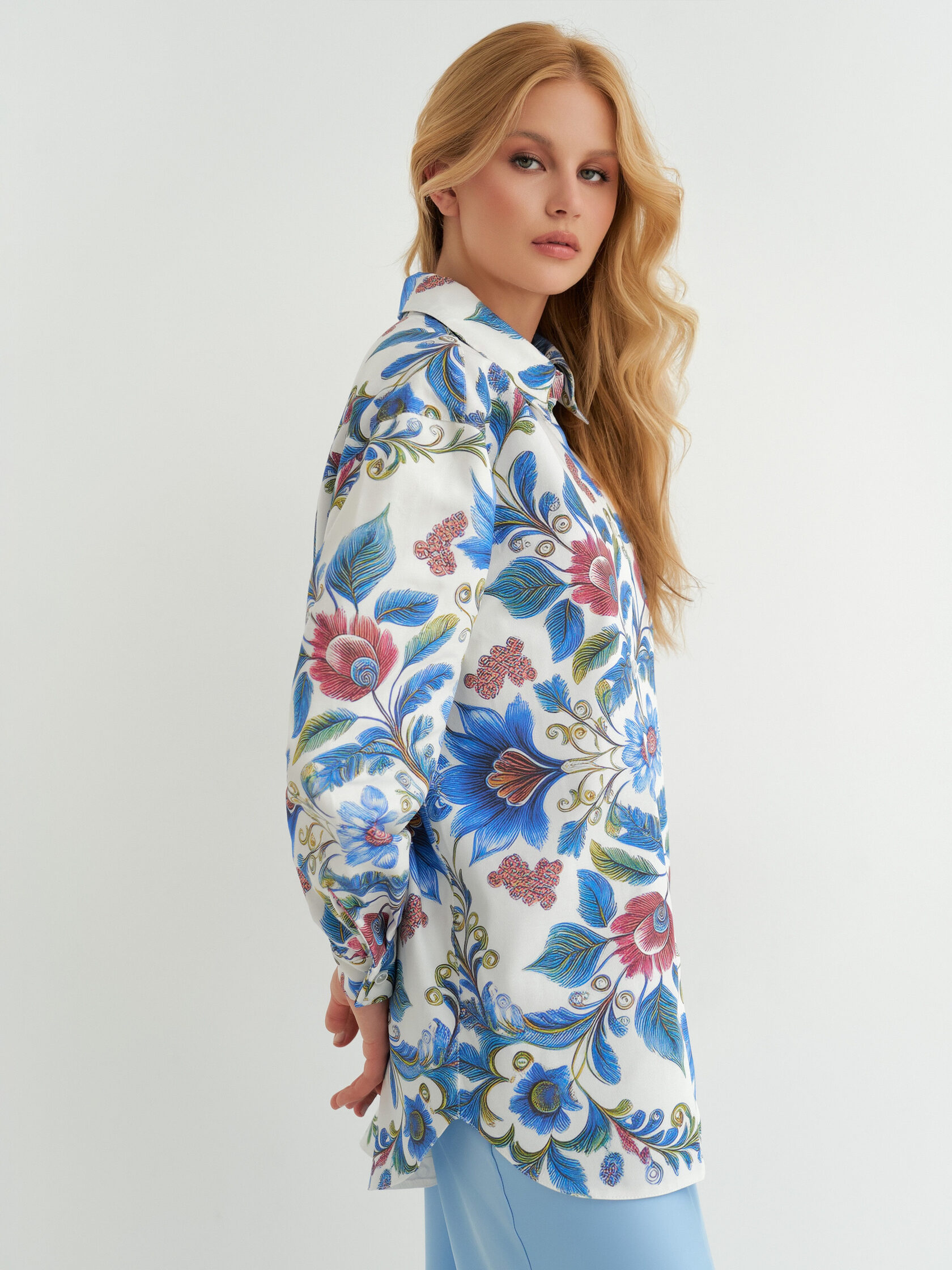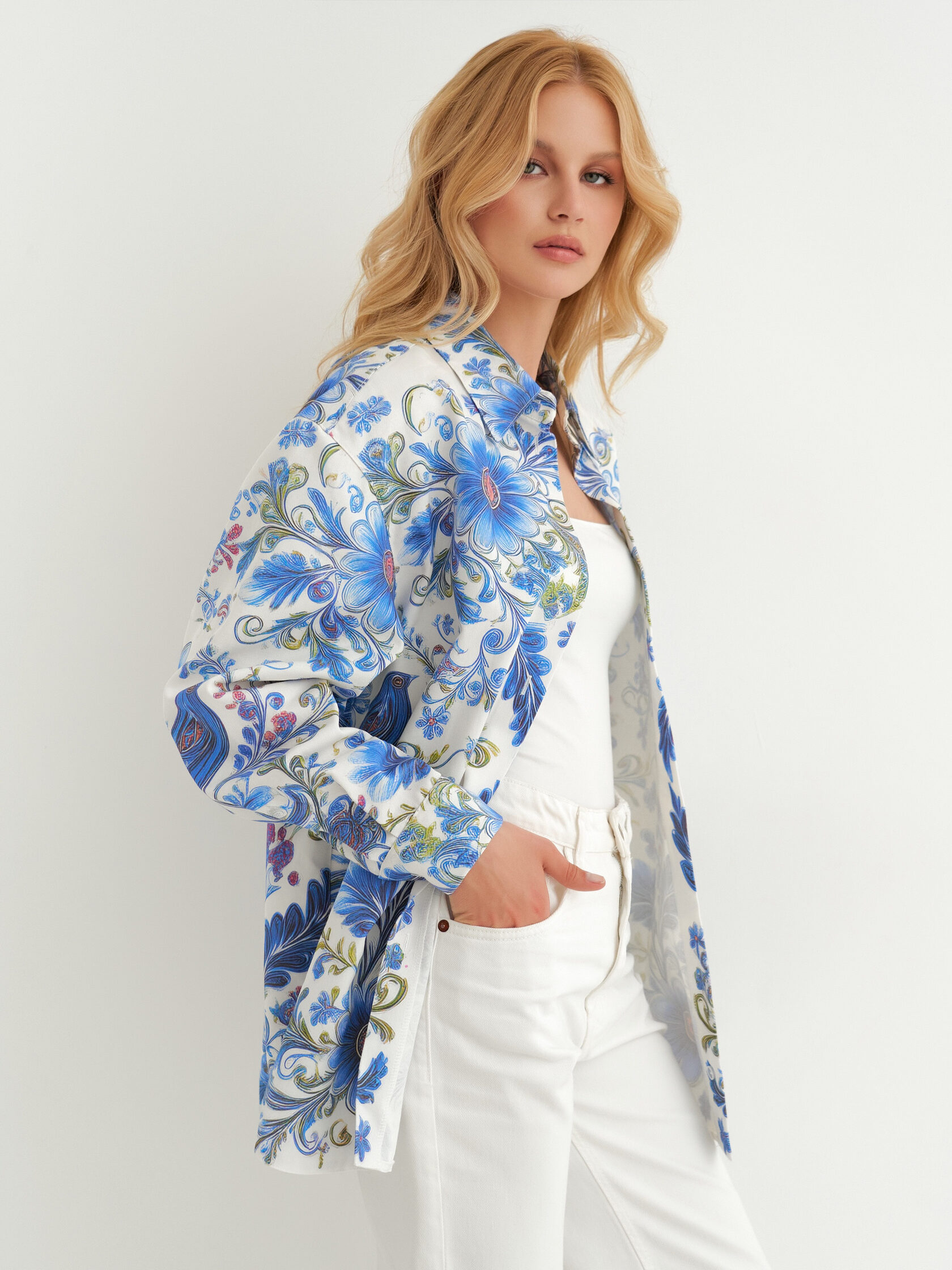 Плотная женская рубашка из 100% хлопка с выразительным принтом, вдохновлённым традиционной русской декоративной росписью. Модель выполнена в свободном силуэте (оверсайз), что делает её универсальной — подходит для любого типа фигуры и комфортна в носке в весенне-осенний период, а также прохладным летом. Основу принта составляет симметричный цветочный орнамент, построенный по канонам народного художественного языка. Центральные цветы — образы солнечной энергии, силы жизни и женского начала. Мотивы листьев и стеблей, переплетающихся в единую линию, отсылают к символам роста, плодородия и природной гармонии. Ритм и симметрия узора формируют визуальную стабильность и ощущение внутреннего порядка — характерную черту обережной символики. Цветовая палитра — насыщенные оттенки охры, терракота, зелени и тёплого серо-синего — придаёт рубашке утончённость и благородство. Белый фон подчёркивает чистоту композиции и делает рисунок особенно выразительным. Рубашка застёгивается на пуговицы, имеет длинный рукав с манжетами и закруглённый низ. Натуральный хлопок средней плотности обеспечивает отличную воздухопроницаемость, мягкость и долговечность. Подходит как самостоятельный элемент гардероба, так и в качестве лёгкой верхней одежды. Идеально сочетается с джинсами, юбками, льняными брюками.