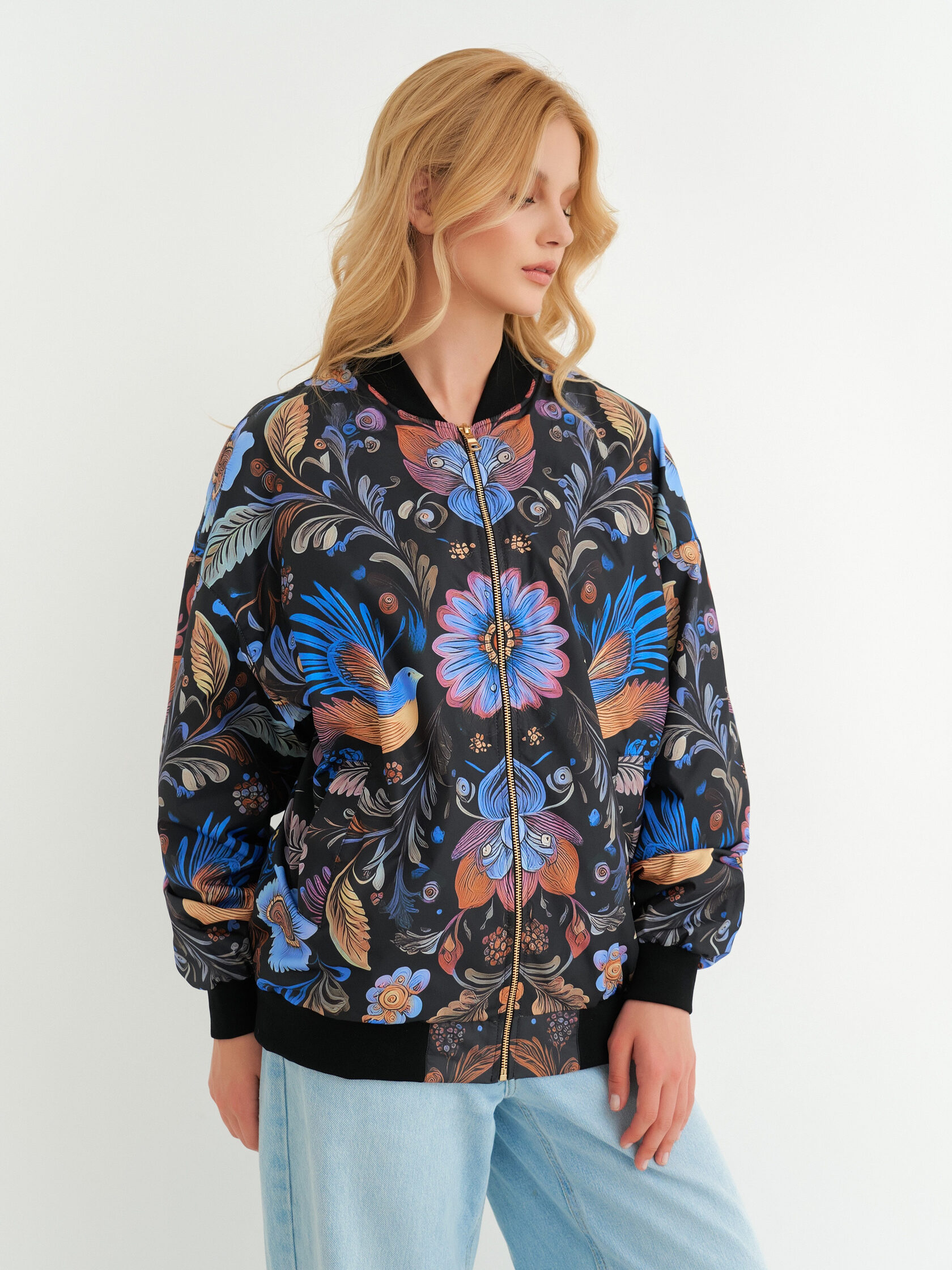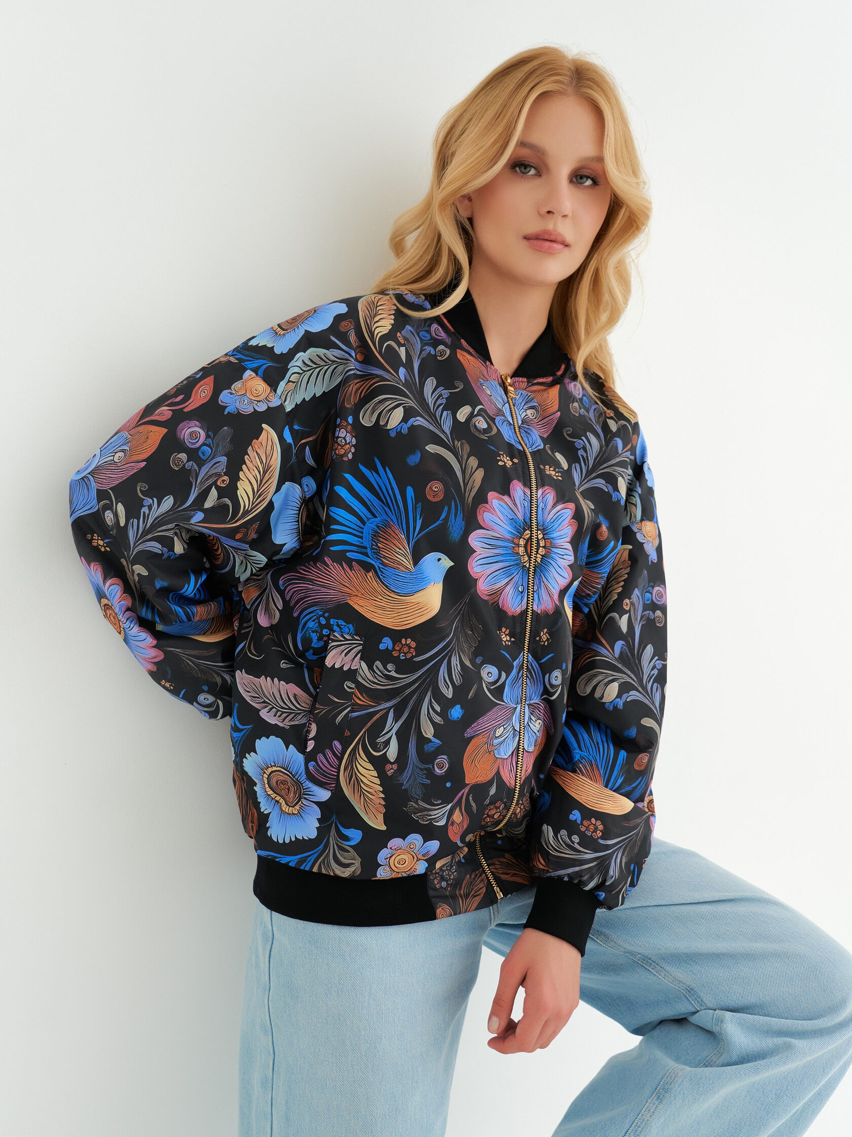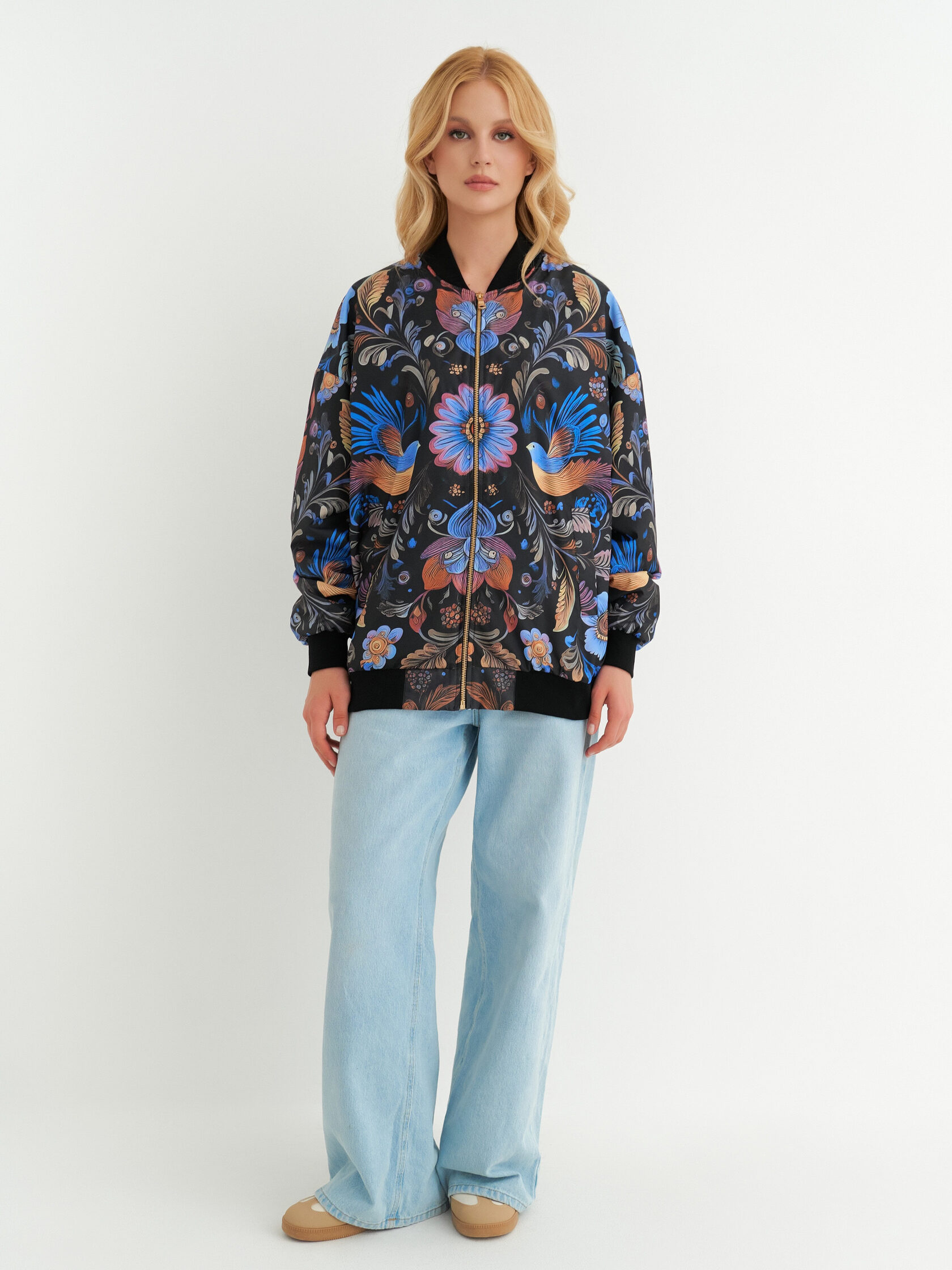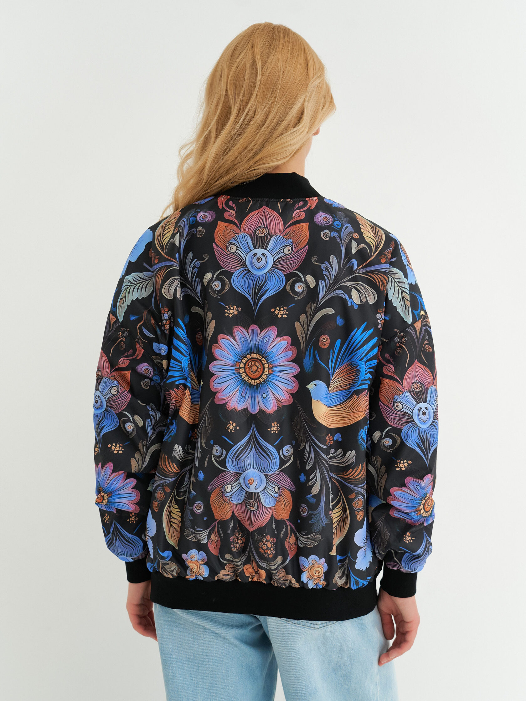 Куртка бомбер с авторским принтом, выполненный в стиле русского декоративного искусства. Яркий арт-рисунок на ткани — это не просто украшение, а символический язык, вдохновлённый народной традицией.