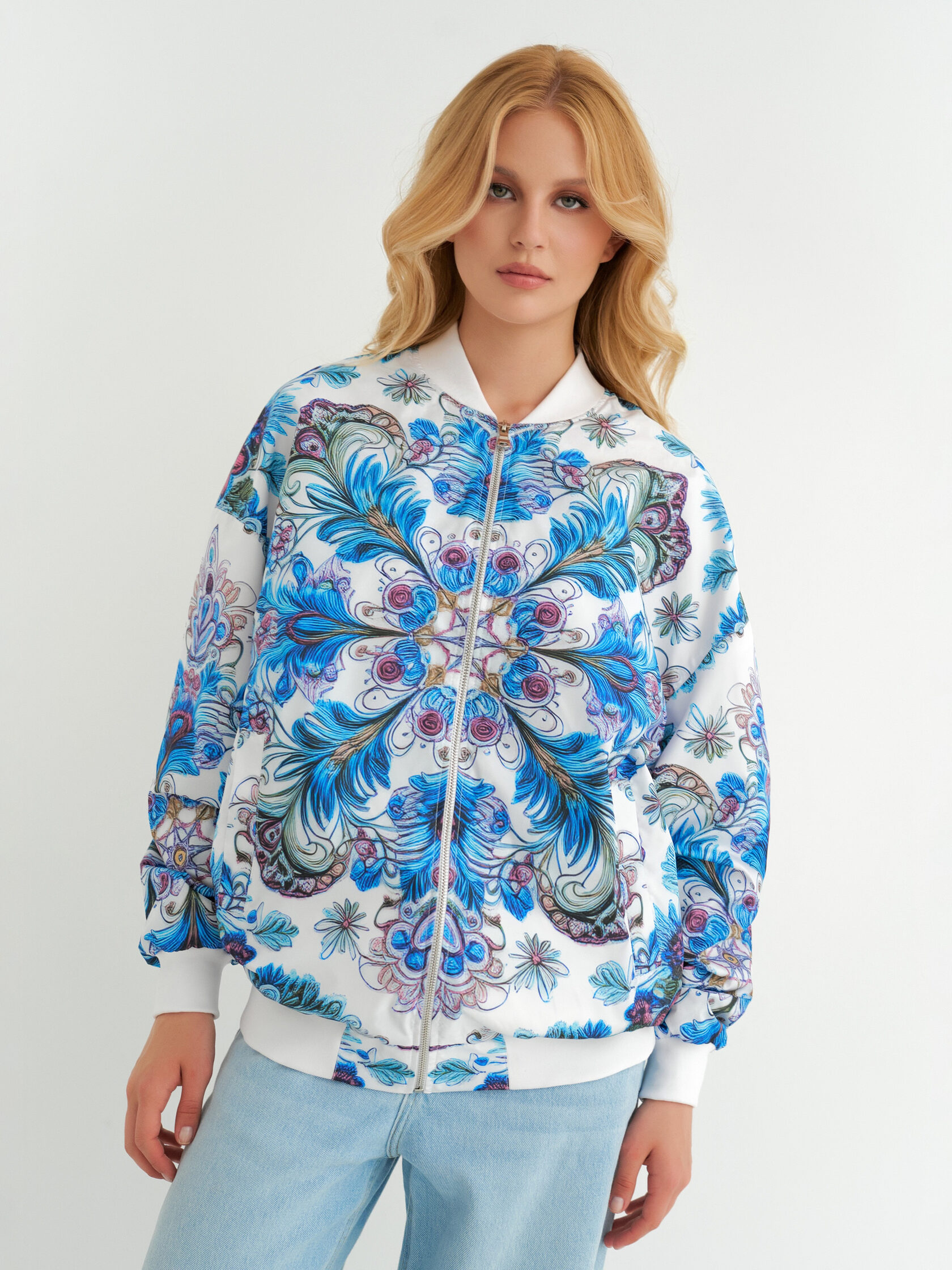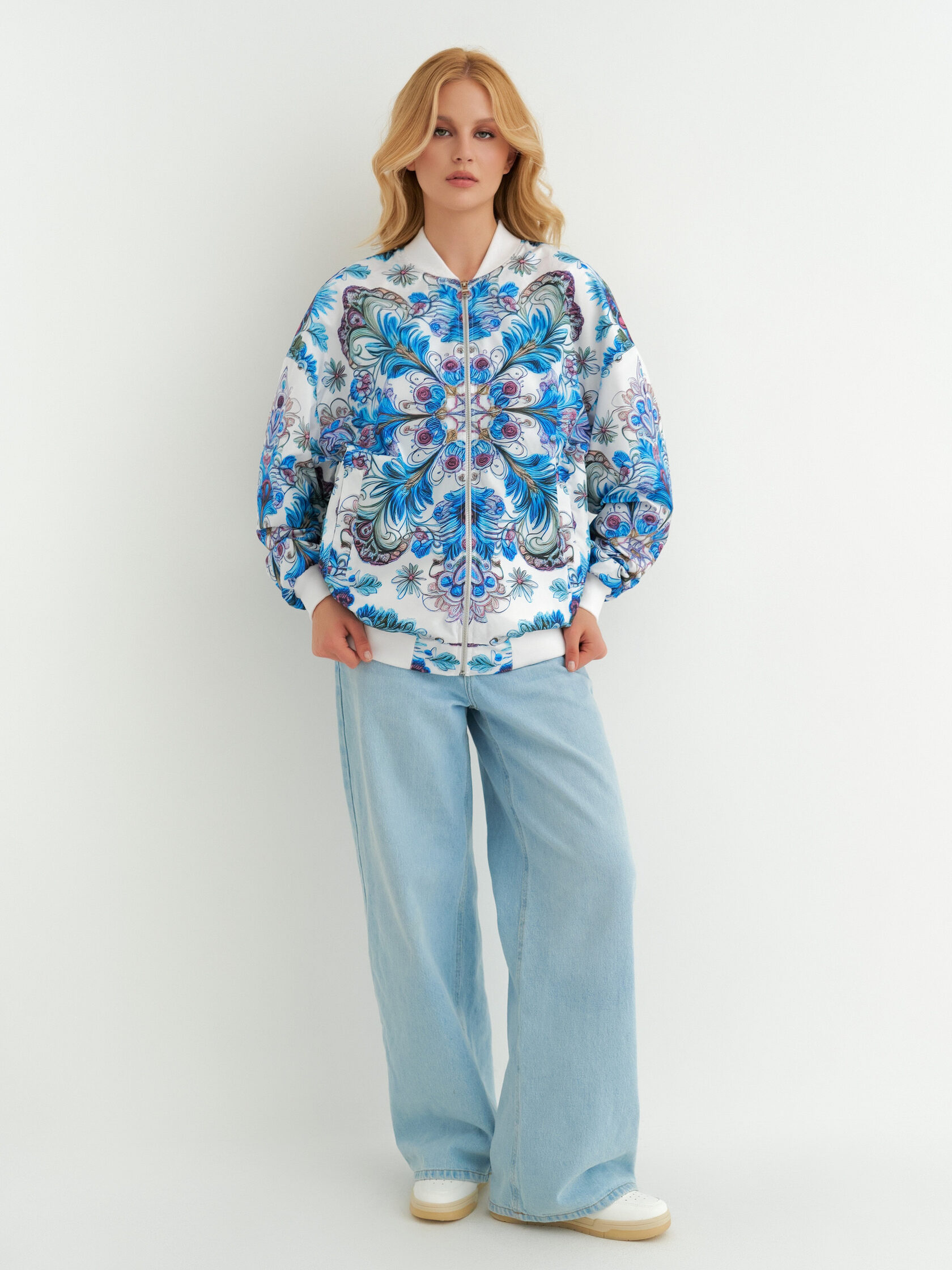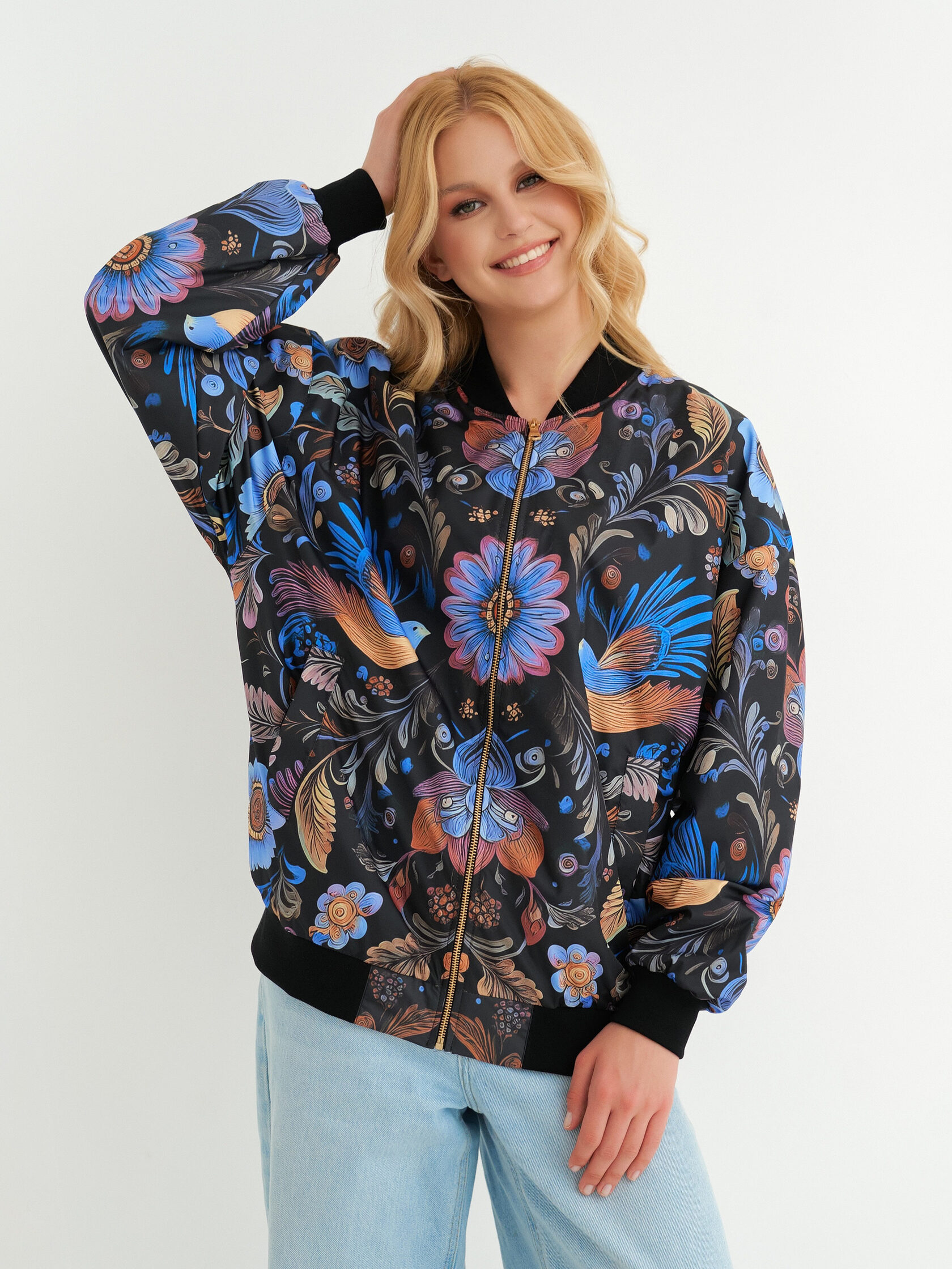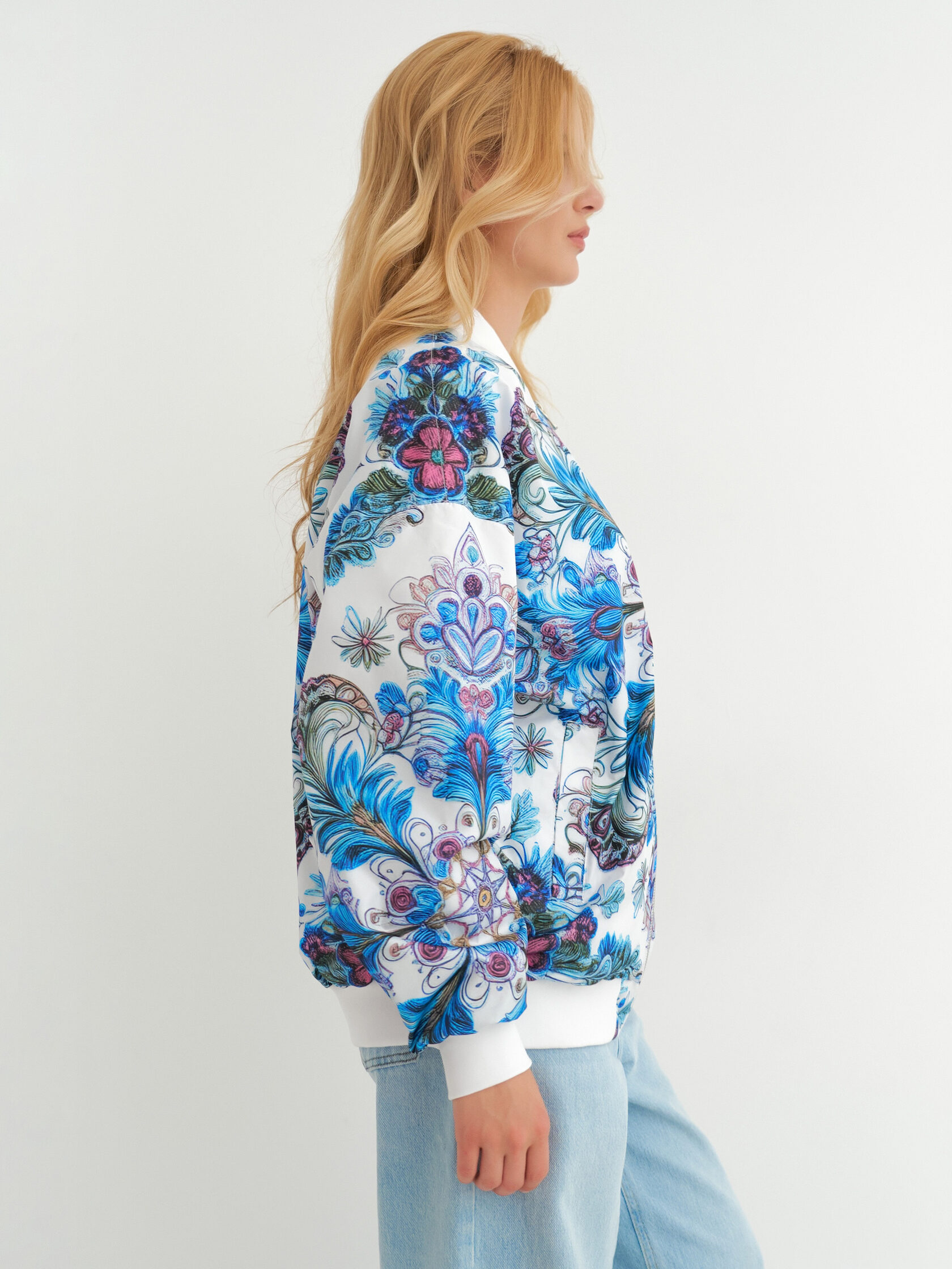 Куртка бомбер с авторским принтом, выполненный в стиле русского декоративного искусства. Яркий арт-рисунок на ткани — это не просто украшение, а символический язык, вдохновлённый народной традицией.