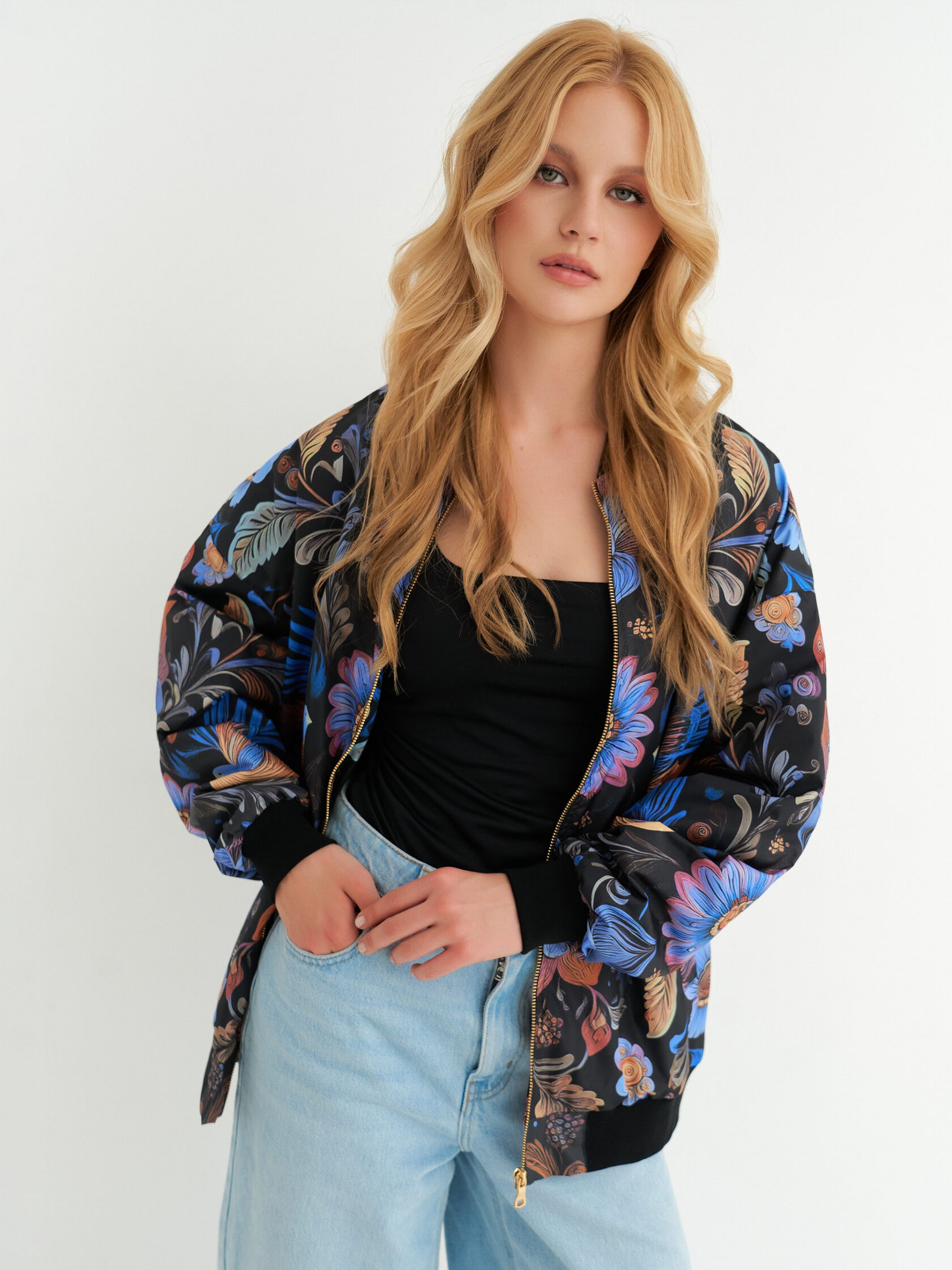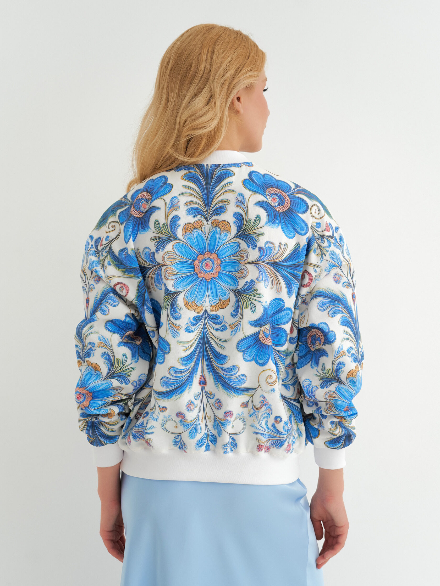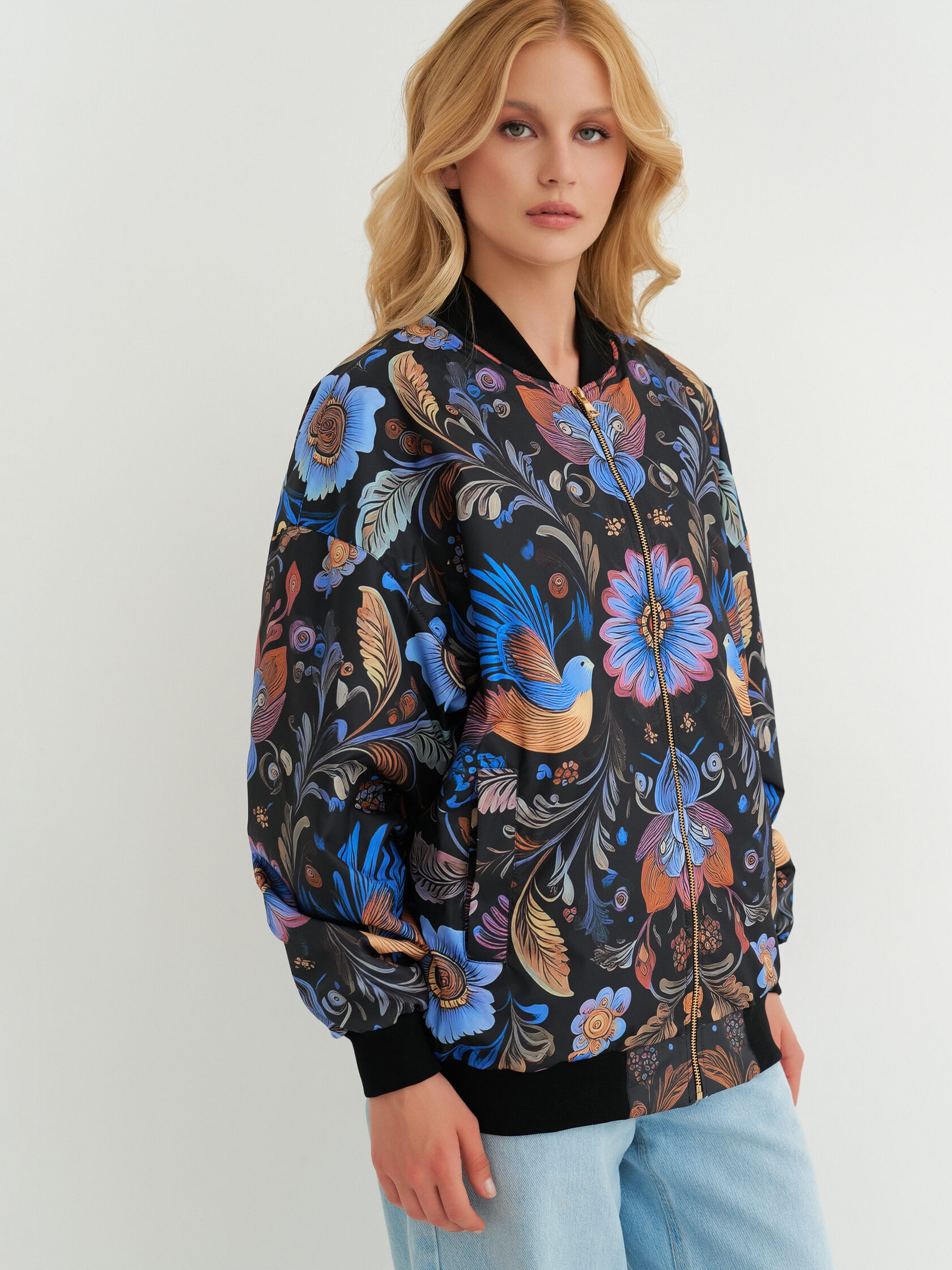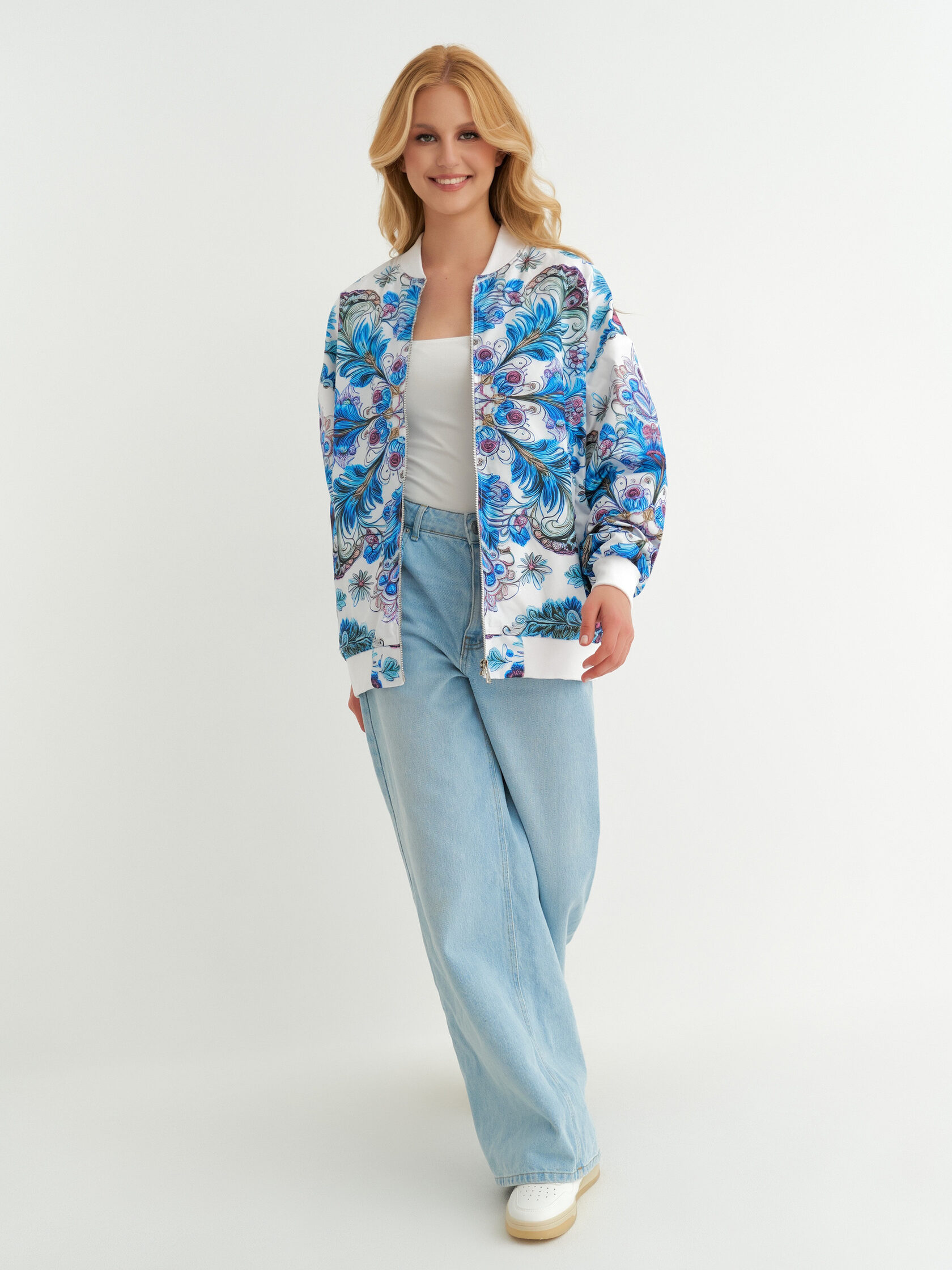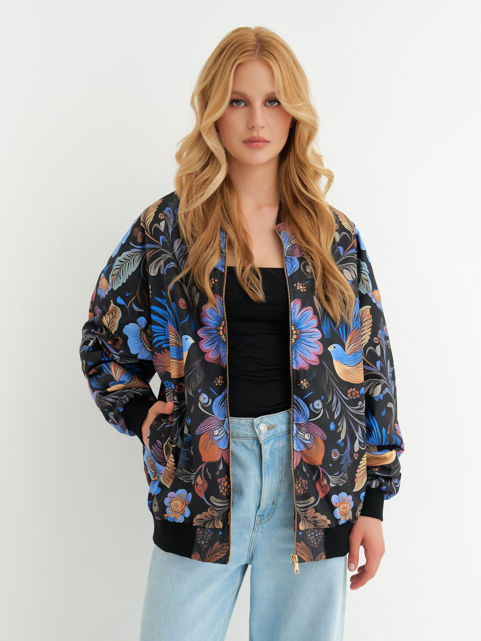 Куртка бомбер с авторским принтом, выполненный в стиле русского декоративного искусства. Яркий арт-рисунок на ткани — это не просто украшение, а символический язык, вдохновлённый народной традицией.