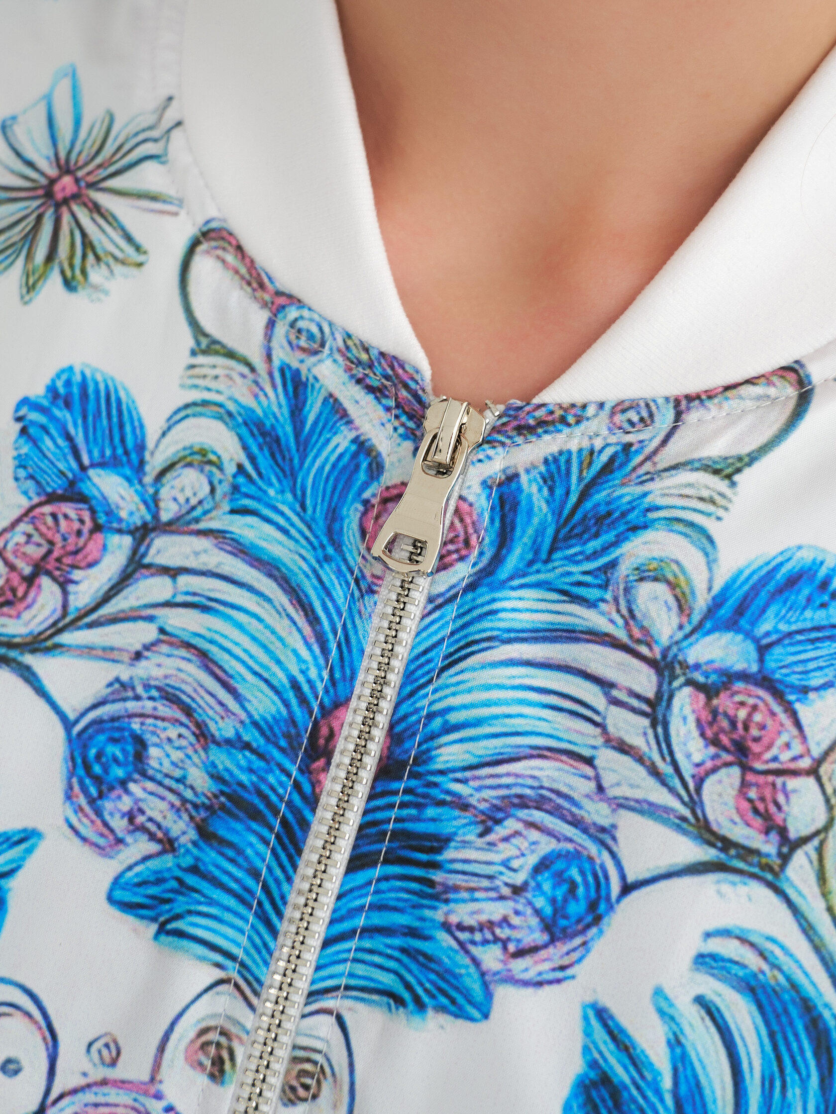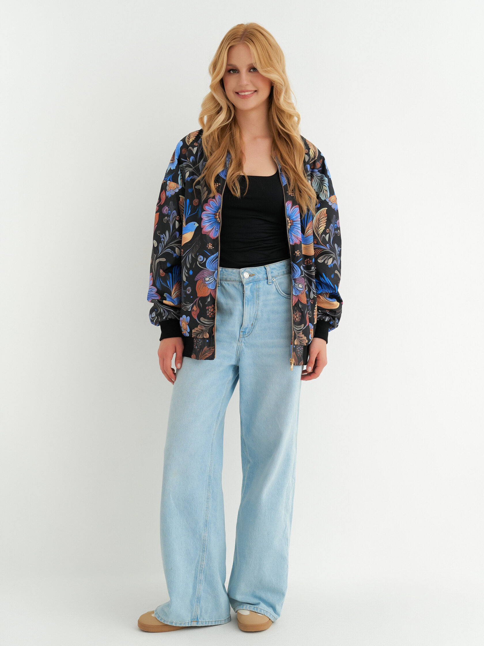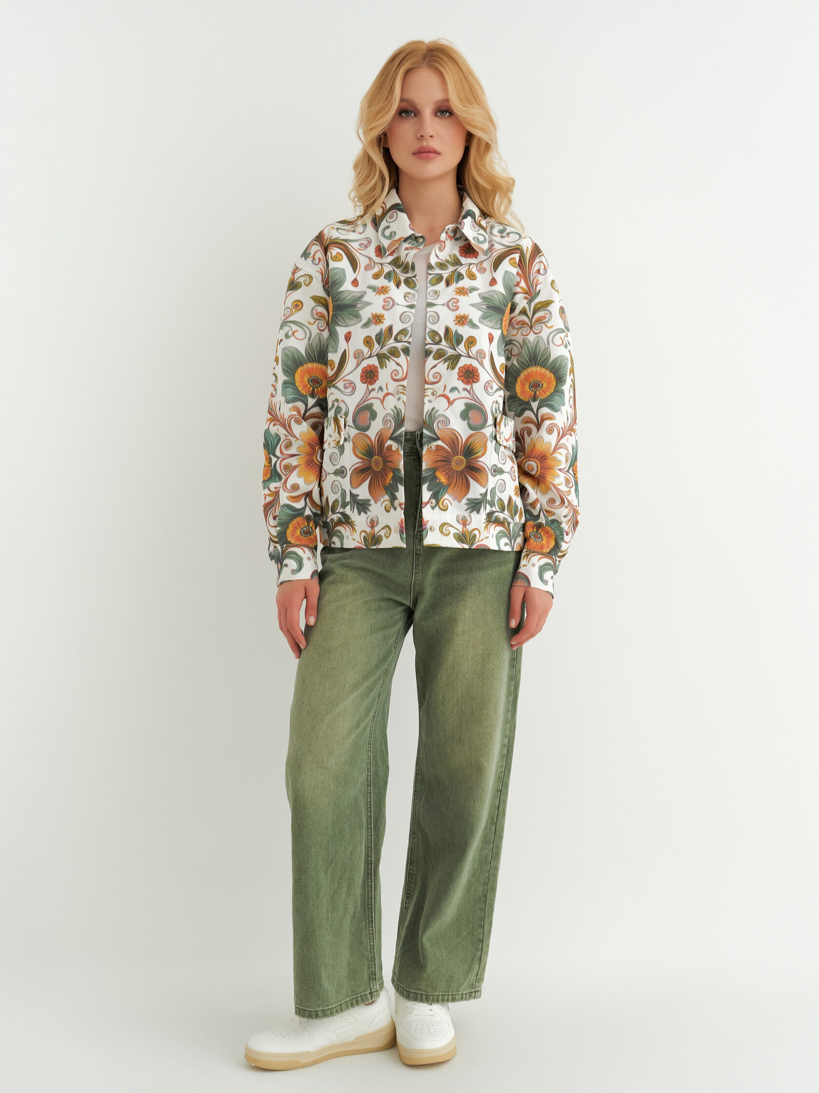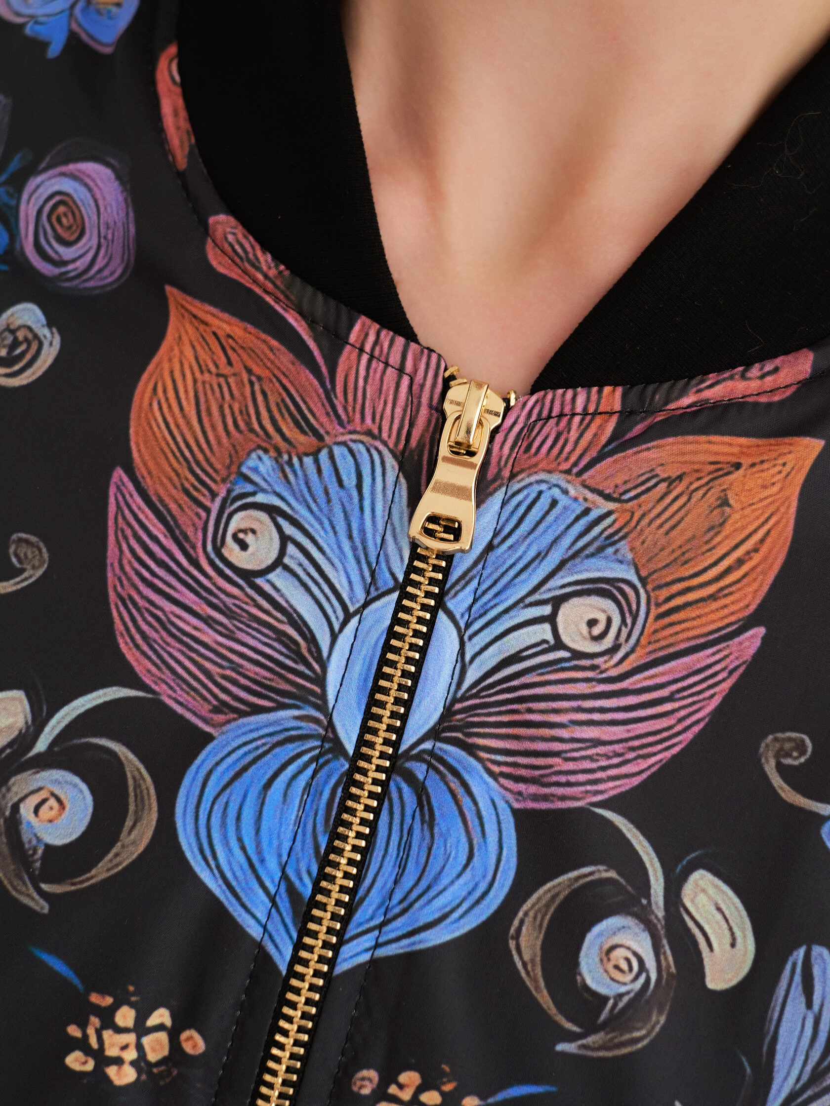 Куртка бомбер с авторским принтом, выполненный в стиле русского декоративного искусства. Яркий арт-рисунок на ткани — это не просто украшение, а символический язык, вдохновлённый народной традицией.