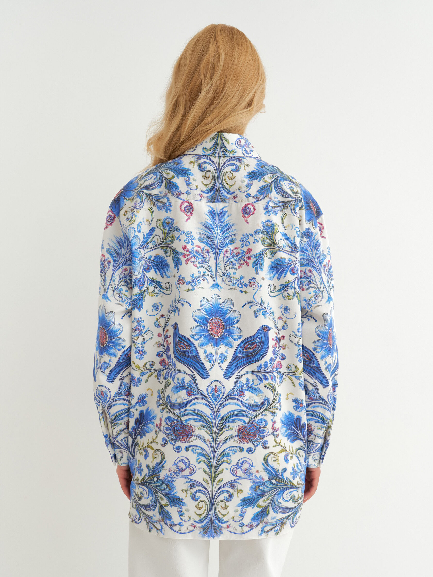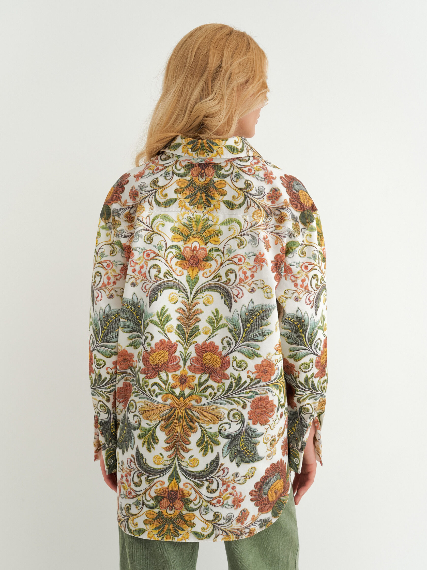 Плотная рубашка свободного кроя из натурального хлопка с выразительным симметричным орнаментом, выполненным в духе традиционных народных росписей. Этот принт — не просто украшение, а образец живой декоративной культуры, в которой каждый элемент несёт смысл.