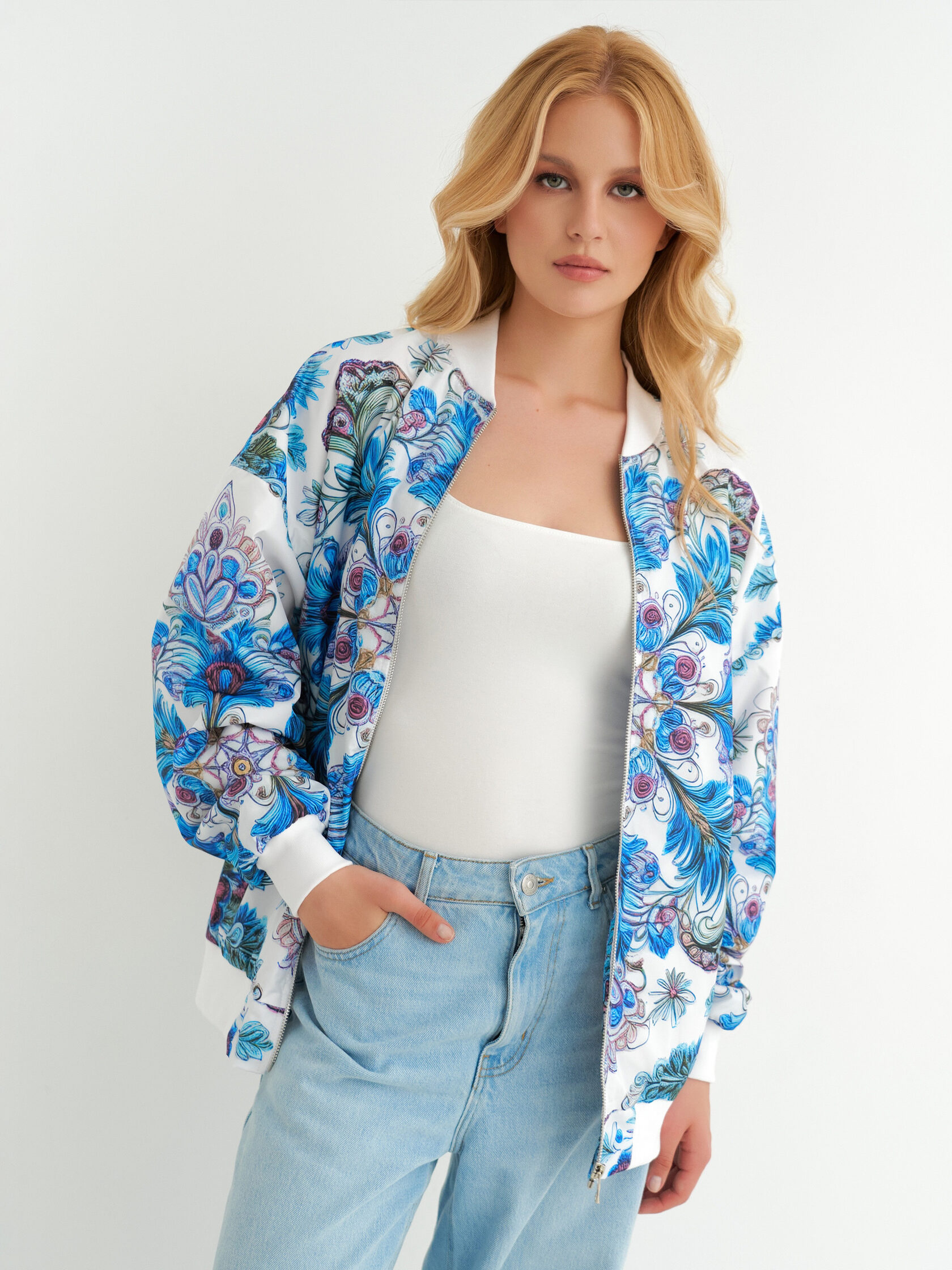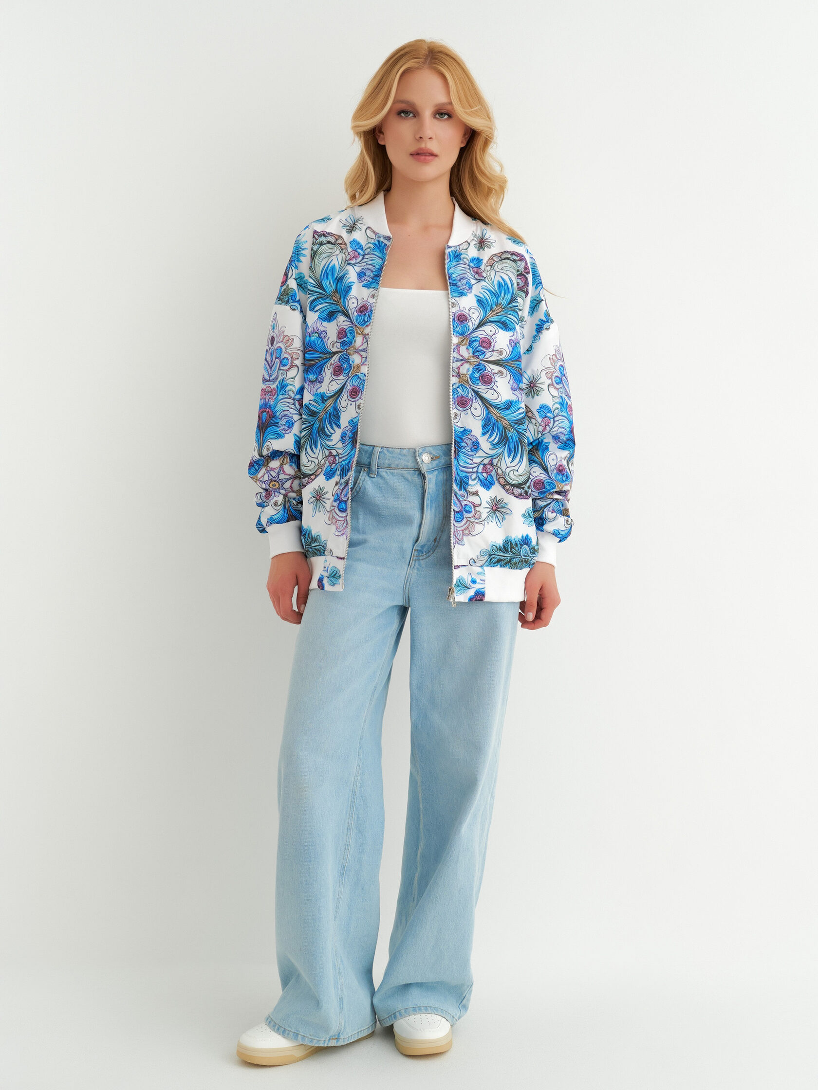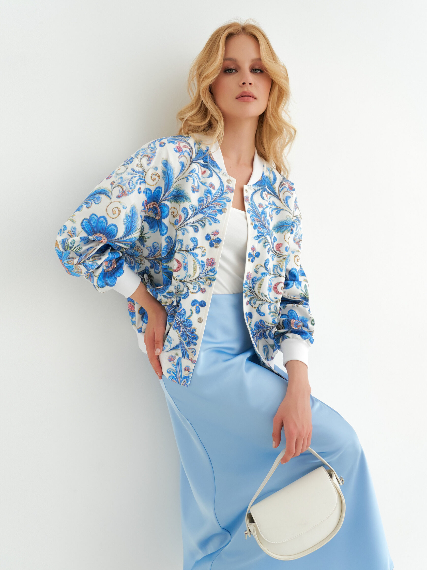 Этот бомбер — не просто предмет одежды. Он — воплощение женственности, света и культурной памяти. В нём природа говорит через линии и краски, а узор становится историей, которую можно носить на себе.Сделано в России
