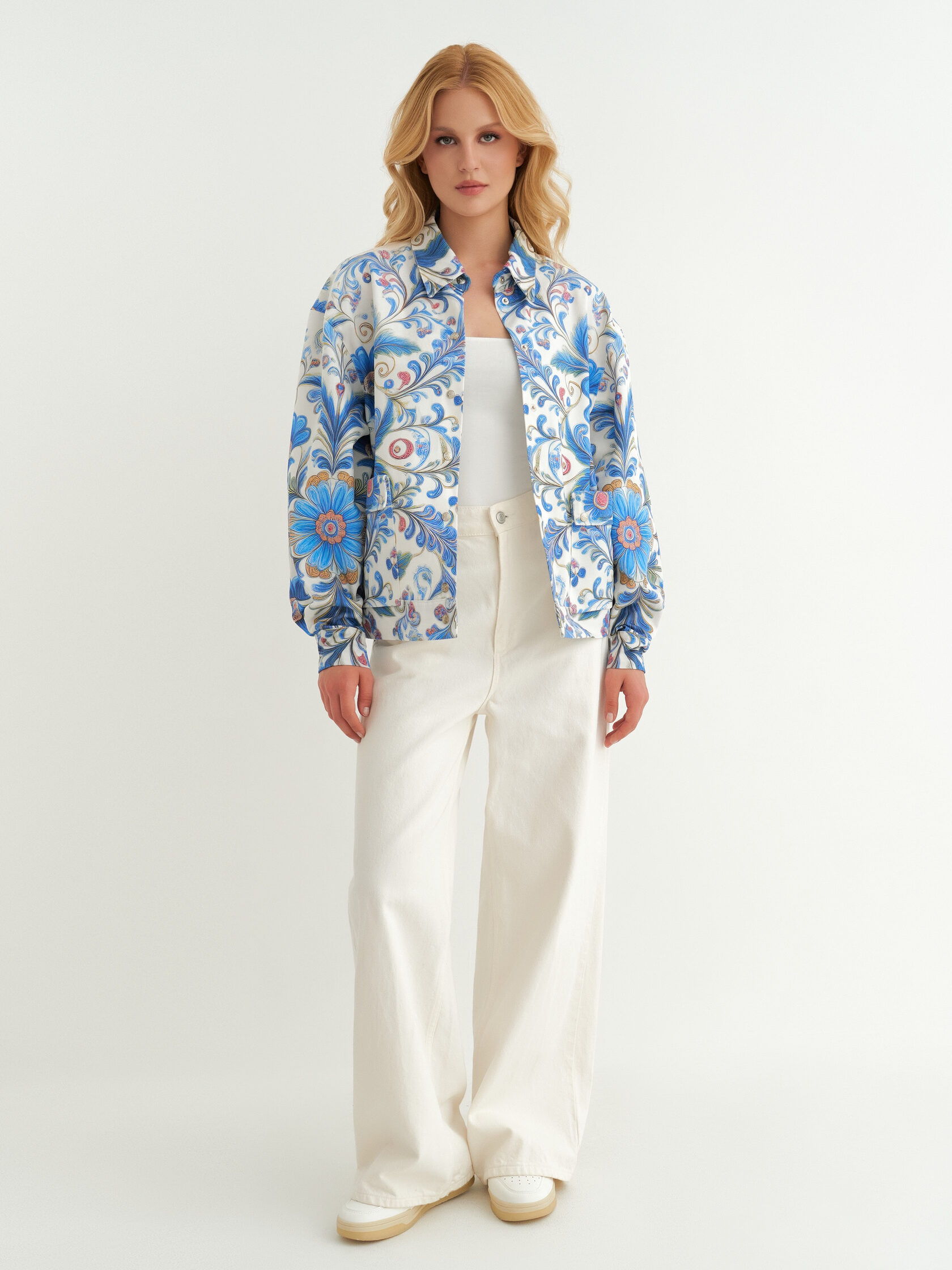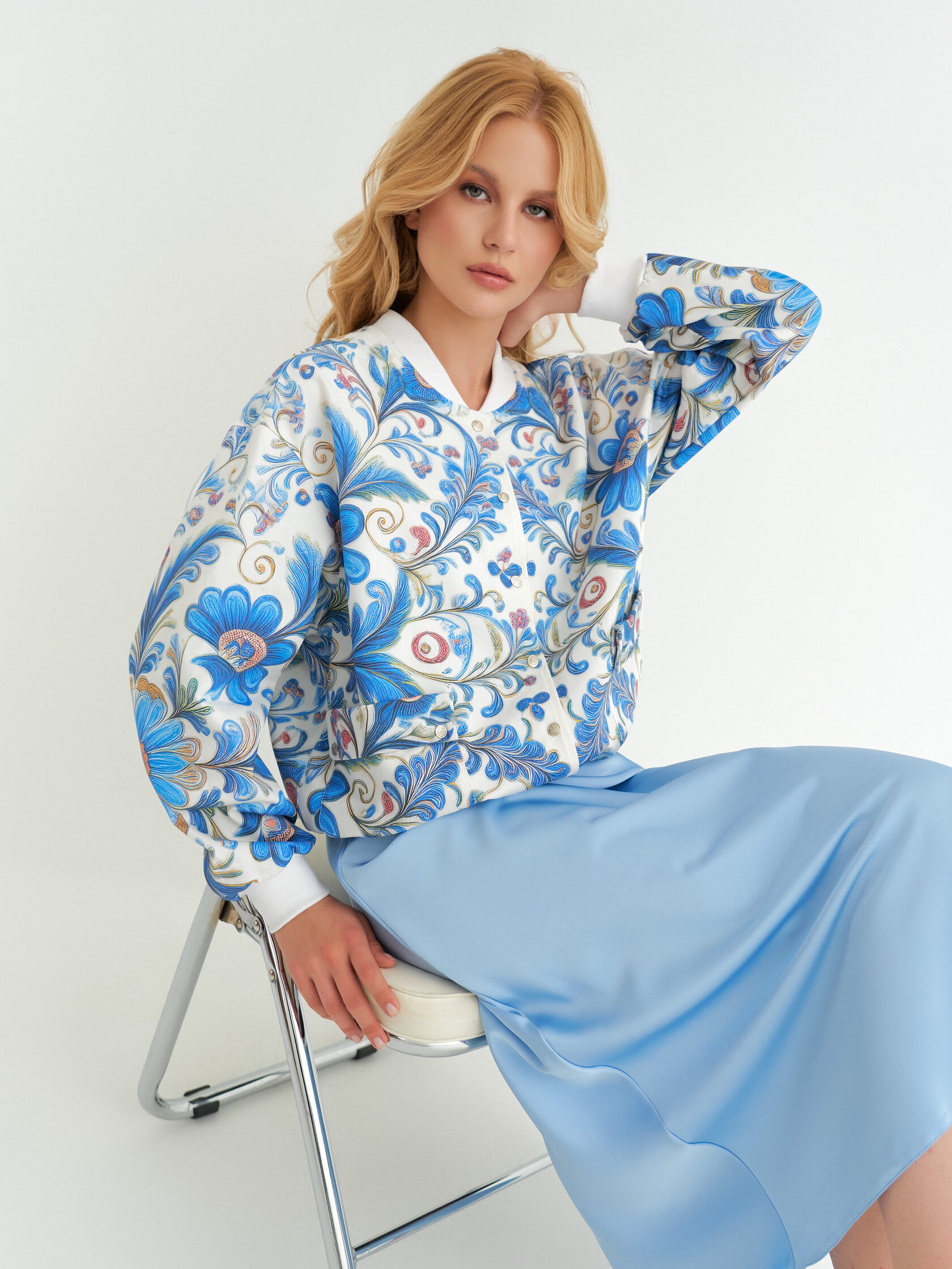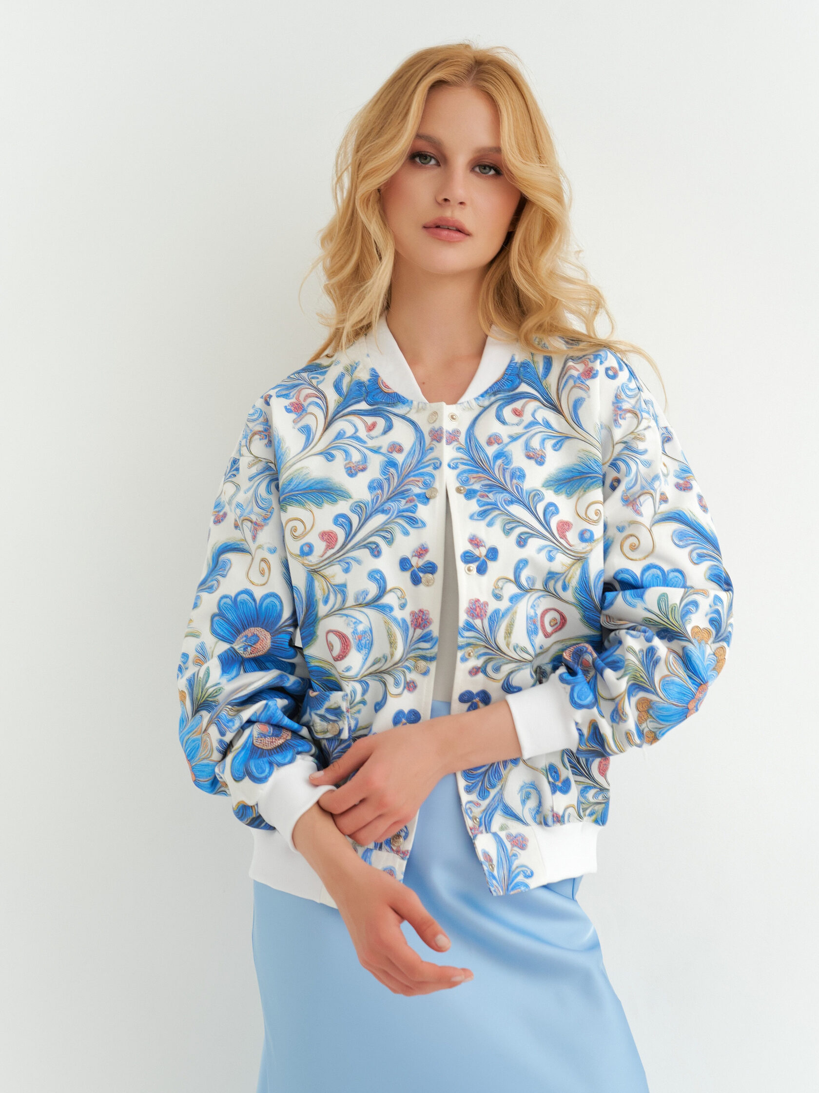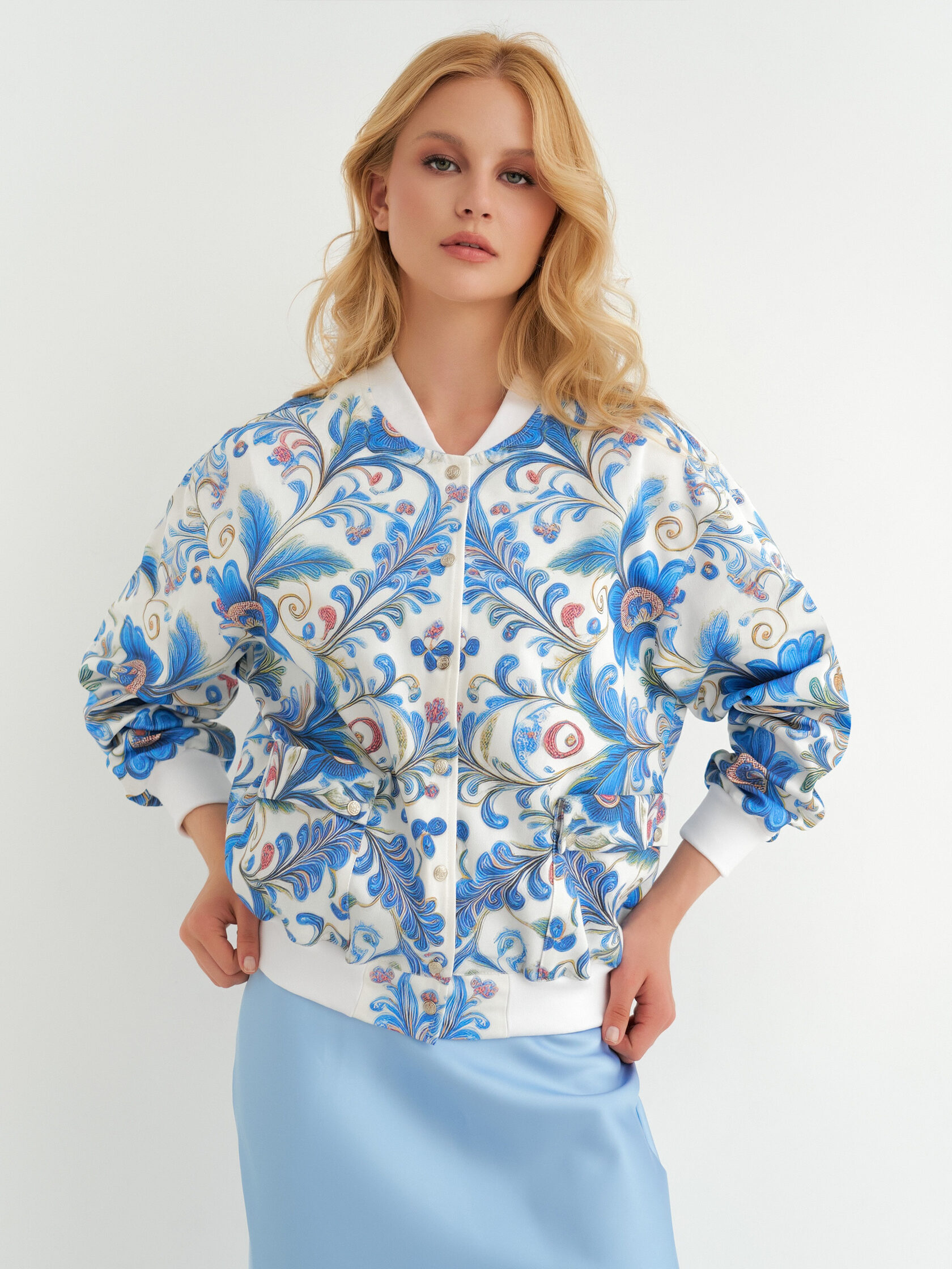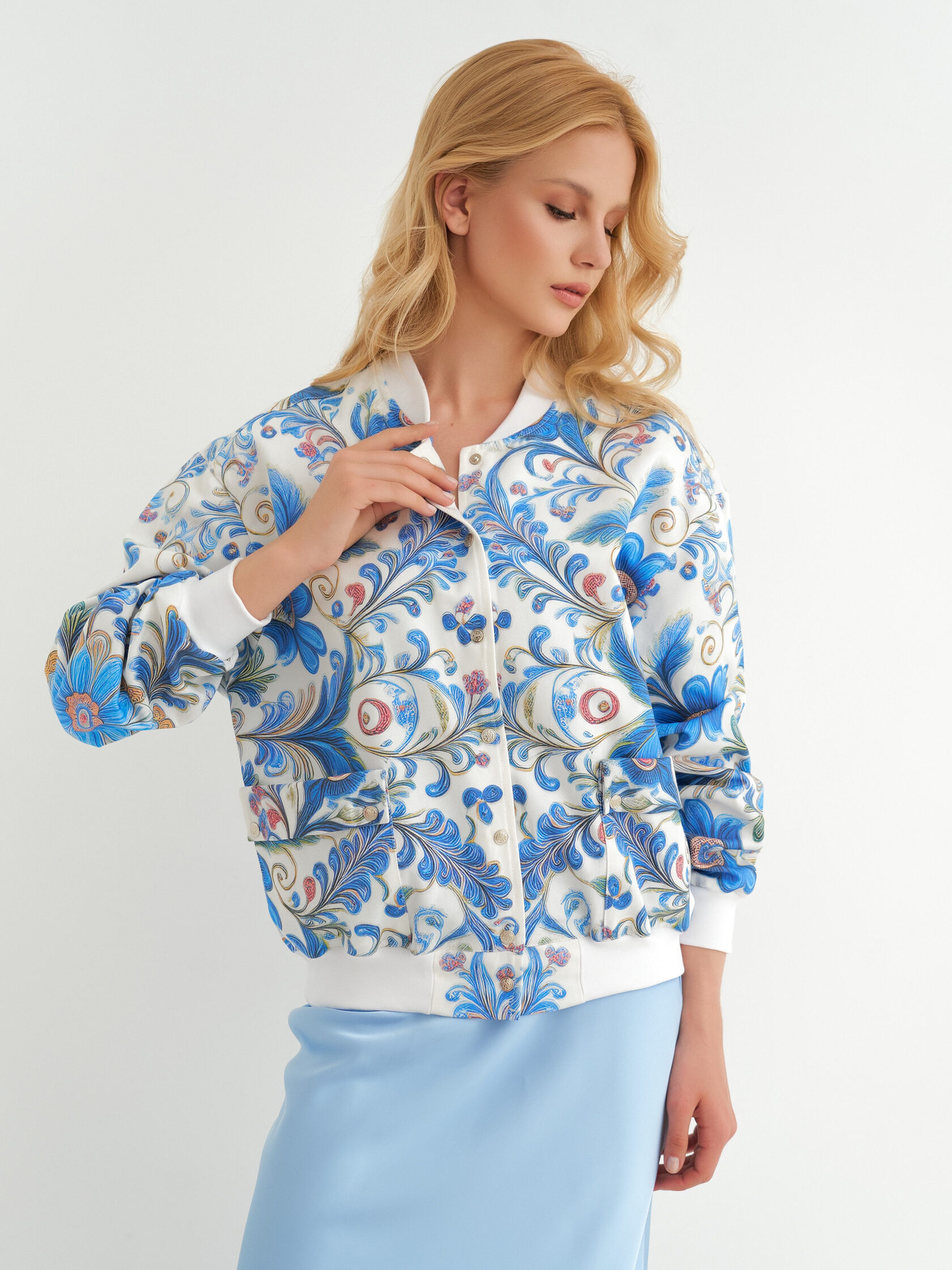 Бомбер на кнопках из 100% хлопка с орнаментом в духе русского декоративного искусства.