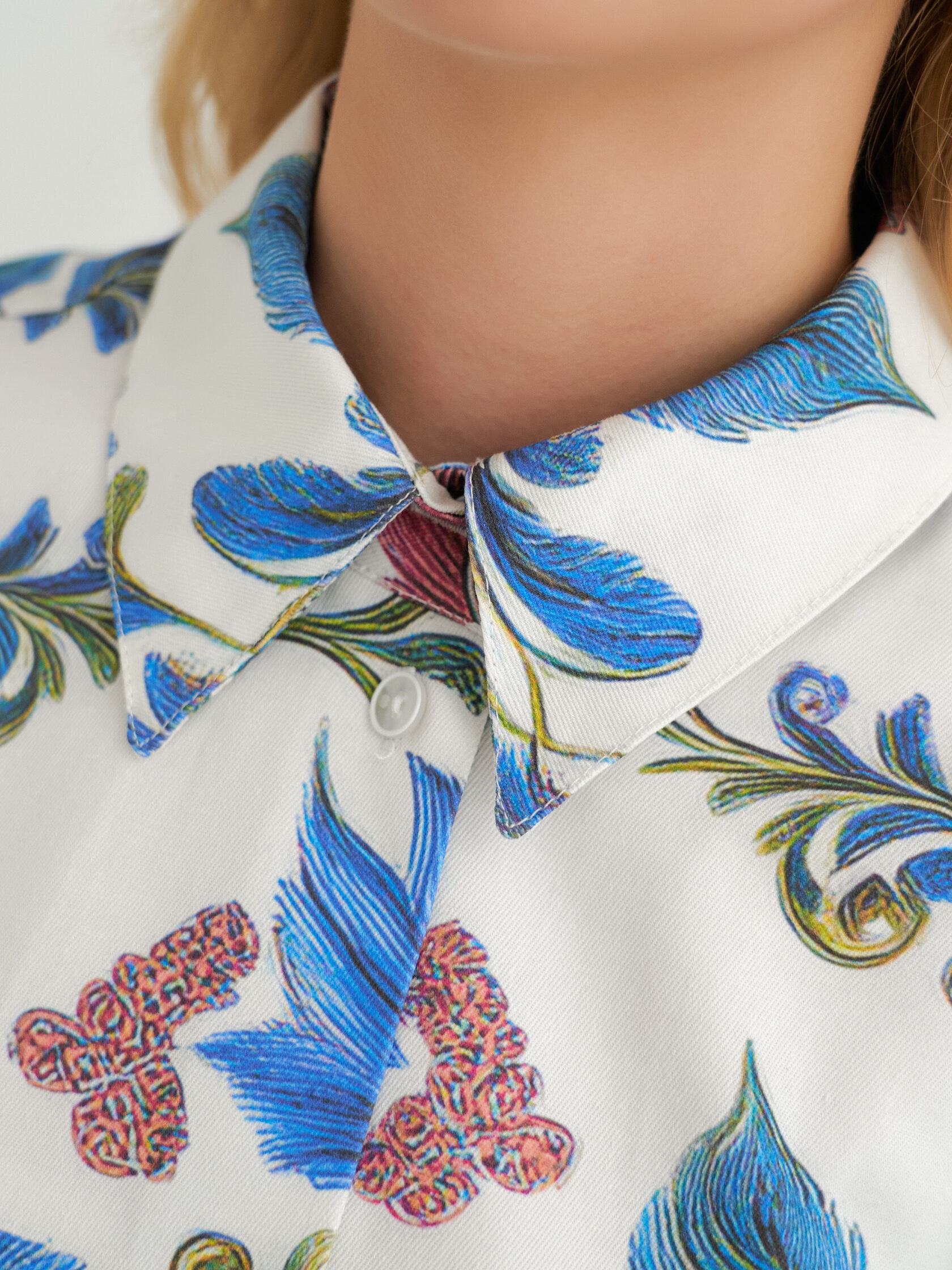 Модель — свободного, слегка удлинённого кроя, с классическим воротником, длинными рукавами на манжетах и округлым низом. Это позволяет носить рубашку как самостоятельный элемент, или как лёгкий жакет поверх майки или платья. Подходит для многослойных образов, путешествий, прогулок и даже для офисов с «свободным дресс-кодом». Цветочный принт делает её акцентной, но не вызывающей — она сочетается как с джинсами, так и с юбками изо льна или шелка.